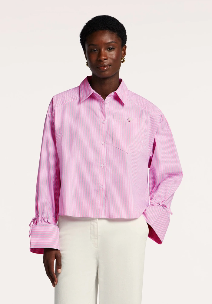 De Bel blouse van Beaumont is uitgevoerd in een zacht streepjespatroon van katoen en polyamide met een vleugje stretch voor extra draagcomfort. Deze korte, boxy blouse heeft een praktische borstzak, sierlijke manchetten met een koord van dezelfde stof, een elegante knoopsluiting aan de voorkant en een dubbele plooi aan de achterkant voor een verfijnde afwerking.