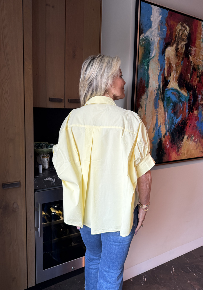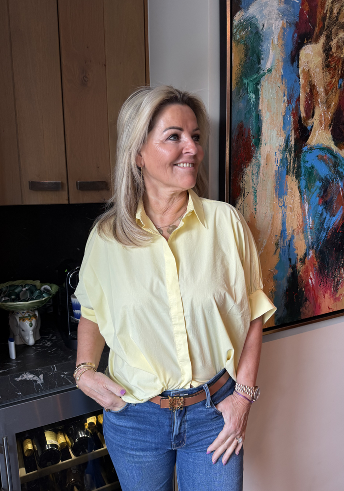 De Bianca blouse van Bardou heeft korte mouwen en is aan de achterkant wat langer. Valt oversized.