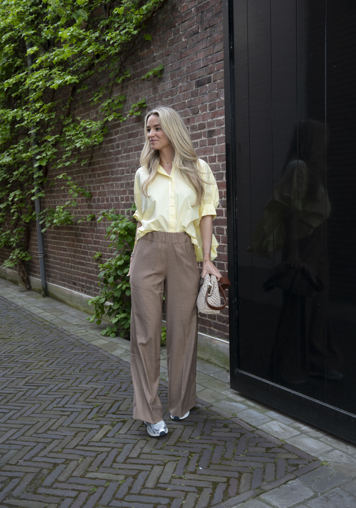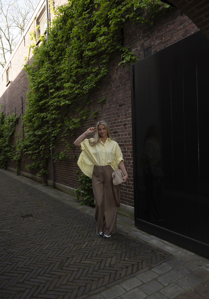 De Bianca blouse van Bardou heeft korte mouwen en is aan de achterkant wat langer. Valt oversized.