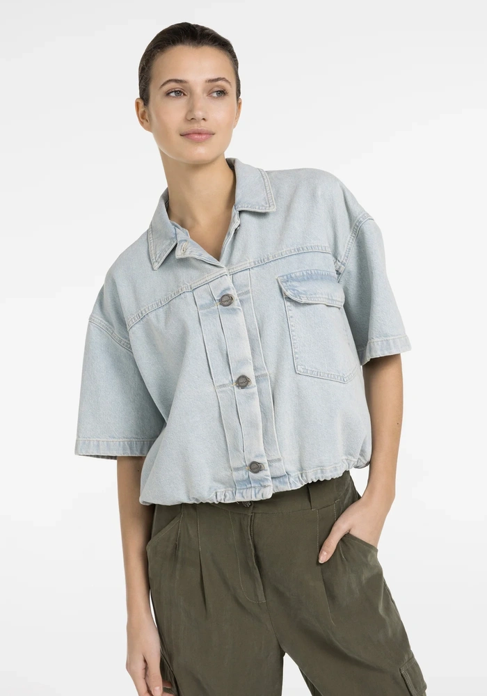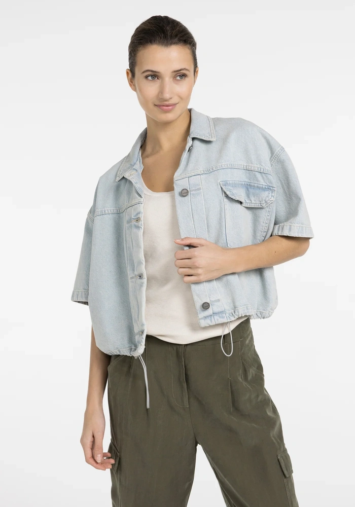 Dit denim jack van Yaya heeft korte mouwen, een kraag en een oversized pasvorm. Het ontwerp heeft een kortere lengte met een elastische onderkant die een subtiel ballonvormig silhouet creëert. De knoopsluiting, de borstzak en het koorddetail aan de achterkant geven een stoere touch.