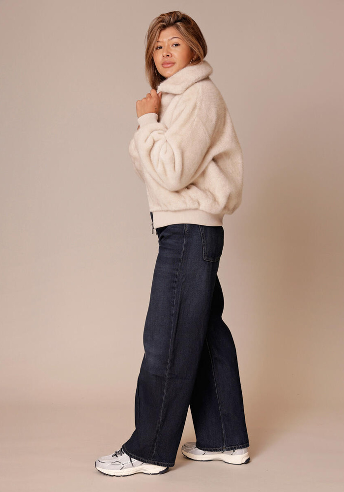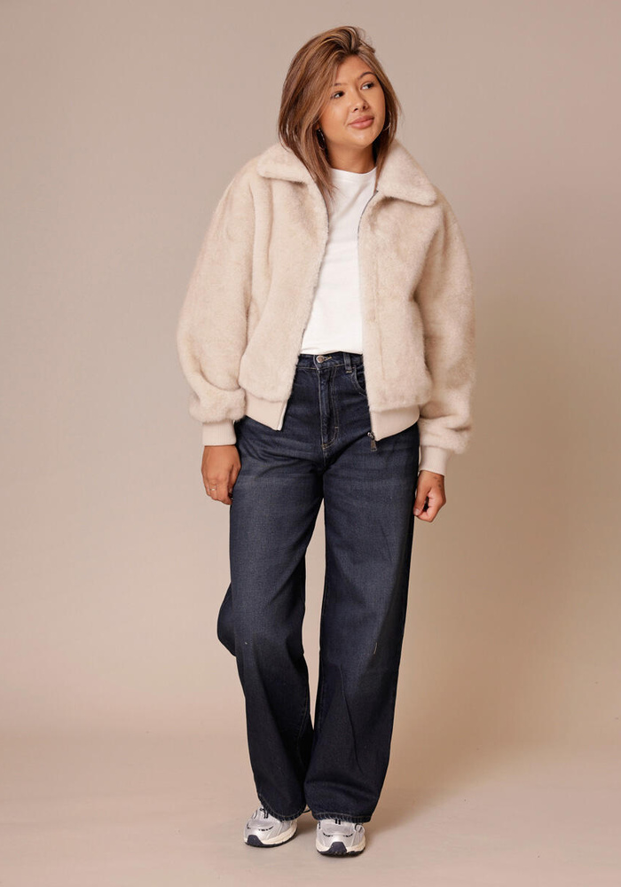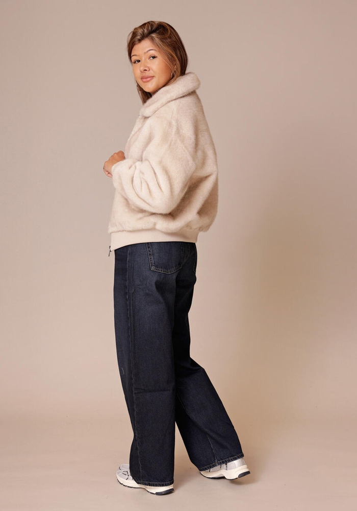 De Alter Ego – Linn jacket in beige is een zachte faux fur jas met een moderne, sportieve uitstraling. Het bombermodel met geribde boorden en kraag combineert comfort met een luxe look. Perfect om zowel casual als chic te dragen tijdens koelere dagen.