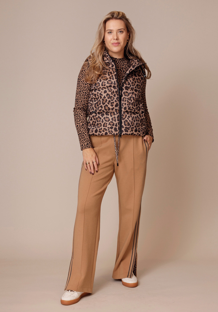 Heuplang vest met nepdonsvulling, capuchon en het duurzame 'Rethink Together'-label. Luipaardprint buiten, contrasterende doggy-print binnen, met tweewegritssluiting en steekzakken voor een functionele, modieuze look met statementkarakter.