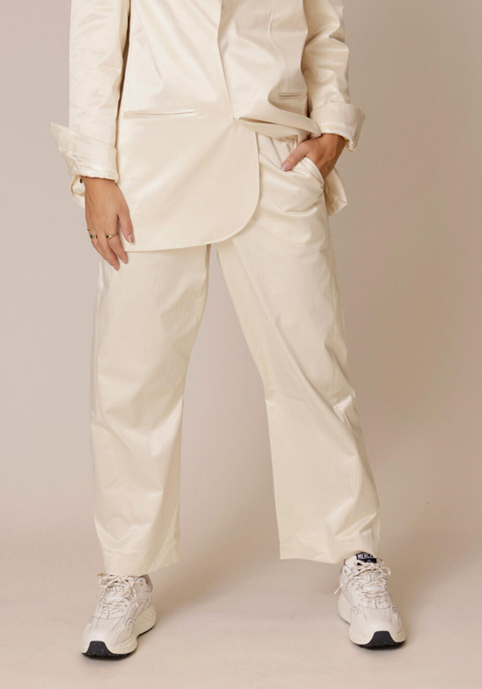 De Dungha pants van Sea Me Happy is een wat korte shiny broek, leuk te combineren met de Bailey blazer.