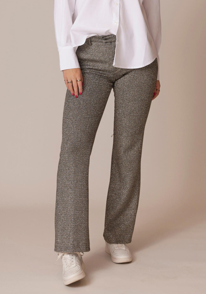 De Joana pants van Mac is een pantalon met wijd uitlopende pijp. De broek heeft een subtiel glittertje en heeft een elastische band in de taille.