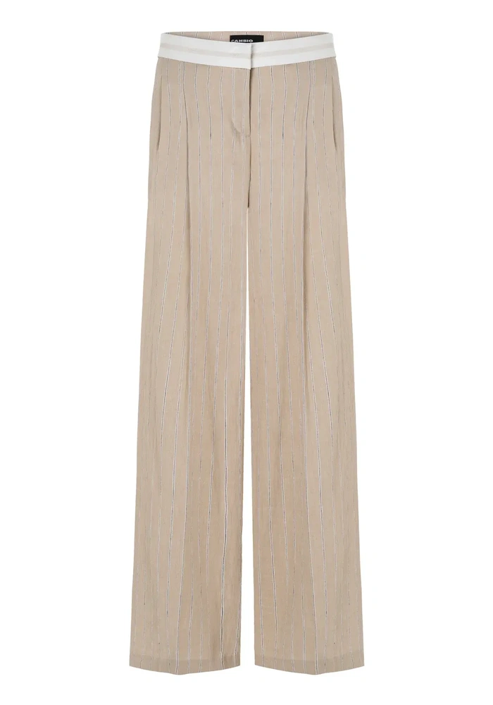 De Anny waistband pants van Cambio is een wijdvallende pantalon met witte band in de taille. De broek heeft een streepjespatroon.