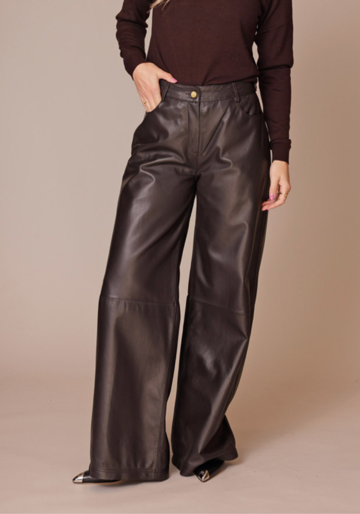 De Morro pants van Studio Ar is een wijdvallende leren broek. De broek valt hoog in de taille en heeft een knoop -en ritssluiting.