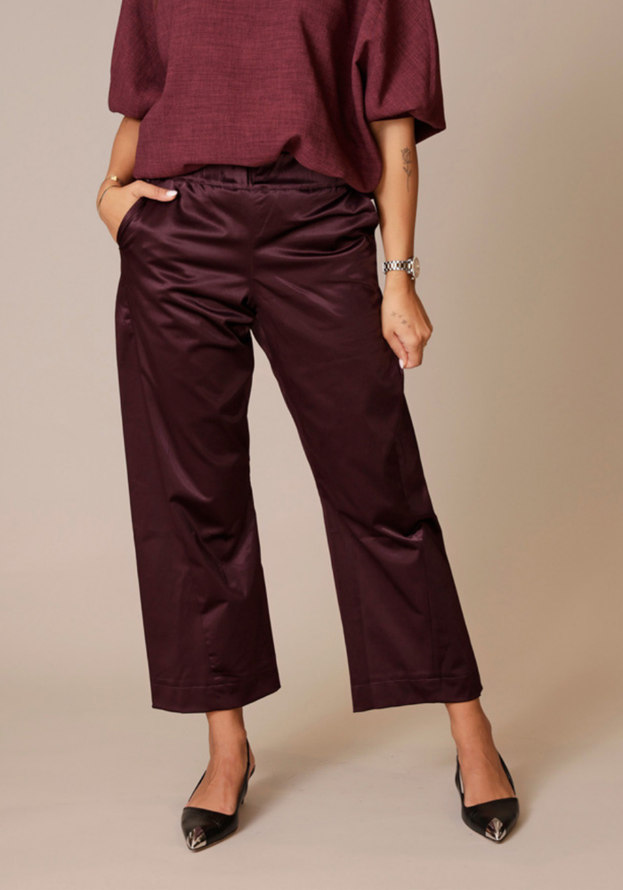 De Dungha pants van Sea Me Happy is een katoenen broek met glanzende afwerking. De broek heeft een kortere lengte en een elastische band in de taille.