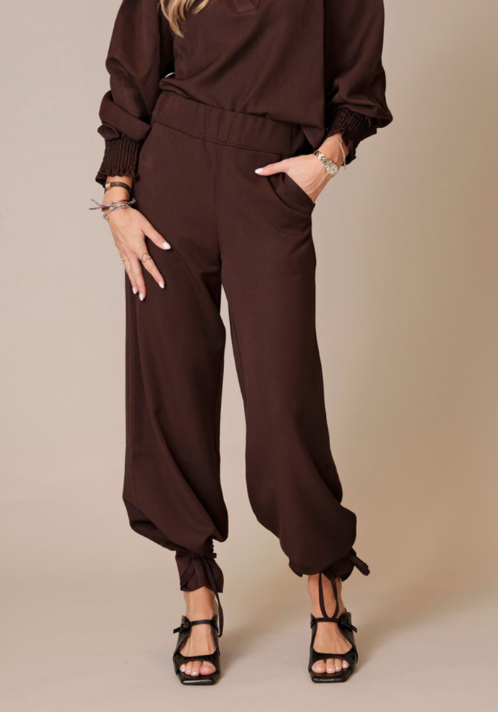 De Sofie pant van Bardou is een wijdvallende pantalon met elastische band in de taille. De broek wordt geleverd met bijpassende touwtjes, deze kun je vastknopen aan de onderzijde van de broek voor een speels effect!