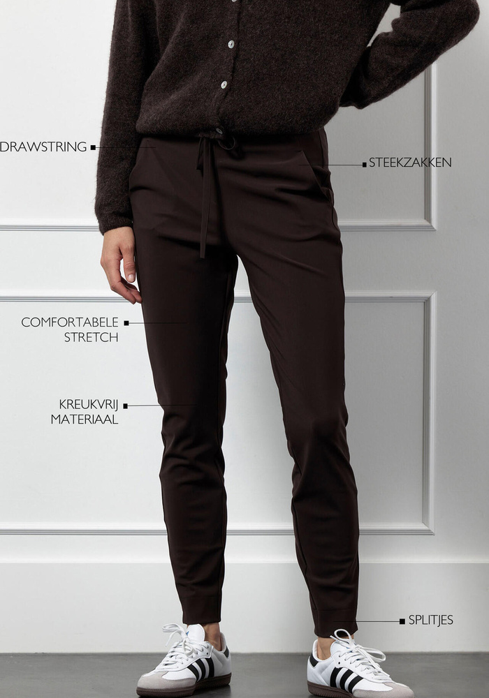 De Downstairs bonded denim trousers van Studio Anneloes is een comfortabele klassieker met een moderne denim print. De slim fit, het trekkoord en de zachte Bonded Travelstof zorgen voor een flatterende en relaxte look.