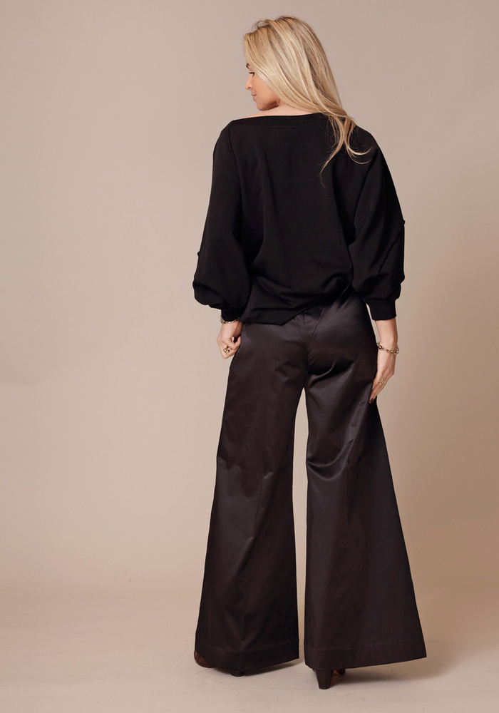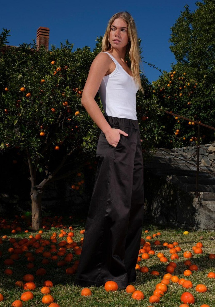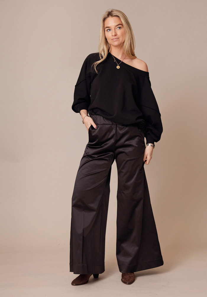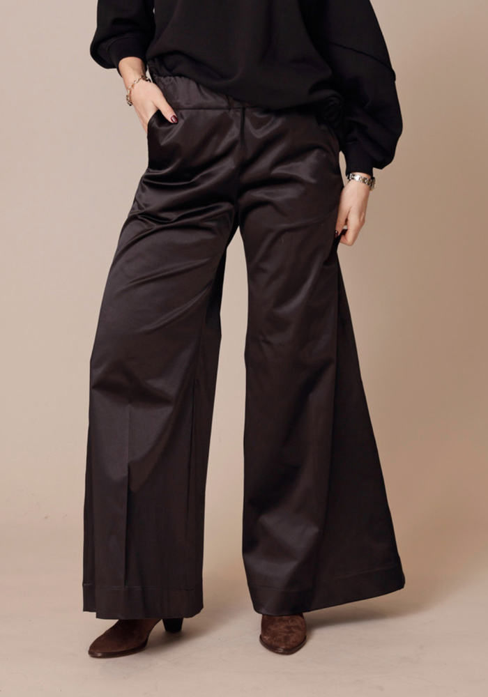 De Super woody pants van Sea me happy heeft een wijde pasvorm en is gemaakt van een glanzende stof. De broek heeft een elastische band in de taille.