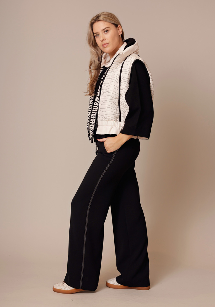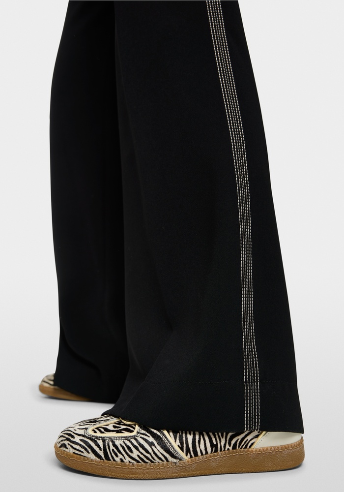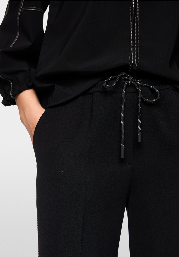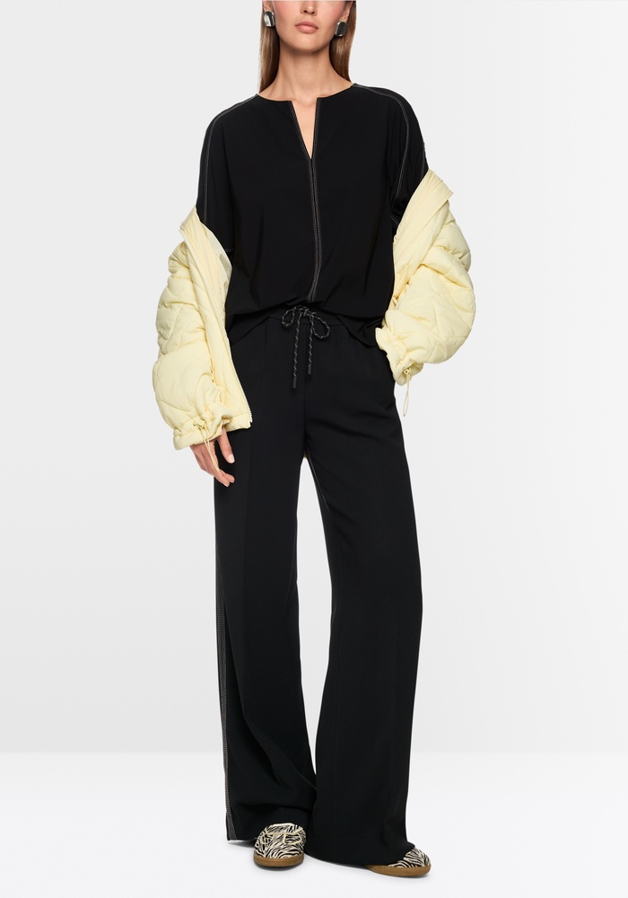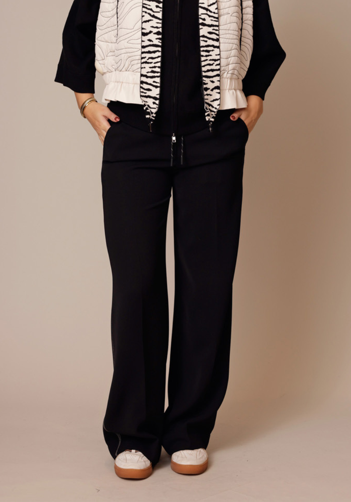 Model WELKOM van Marccain is een soepelvallende stoffen broek in joggingstijl. De wijde pijpen, persvouw en extra lengte geven ’m een moderne look. De elastische tailleband met trekkoord zit supercomfortabel en de steekzakken maken het helemaal praktisch.