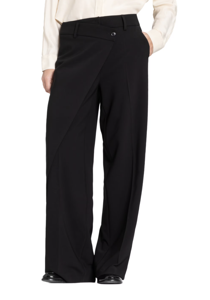 De Anais wrap front broek van Cambio in volledige lengte. Deze broek is een echt statement stuk uit de huidige collectie, die modern design combineert met elegante casualness. De asymmetrische tailleband met een overlappend wikkeldetail geeft de stijl een stijlvol tintje en maakt het een echte opvallende.