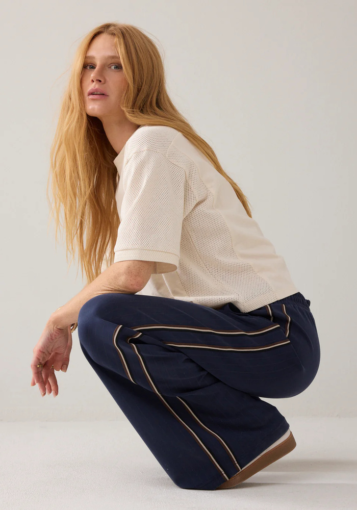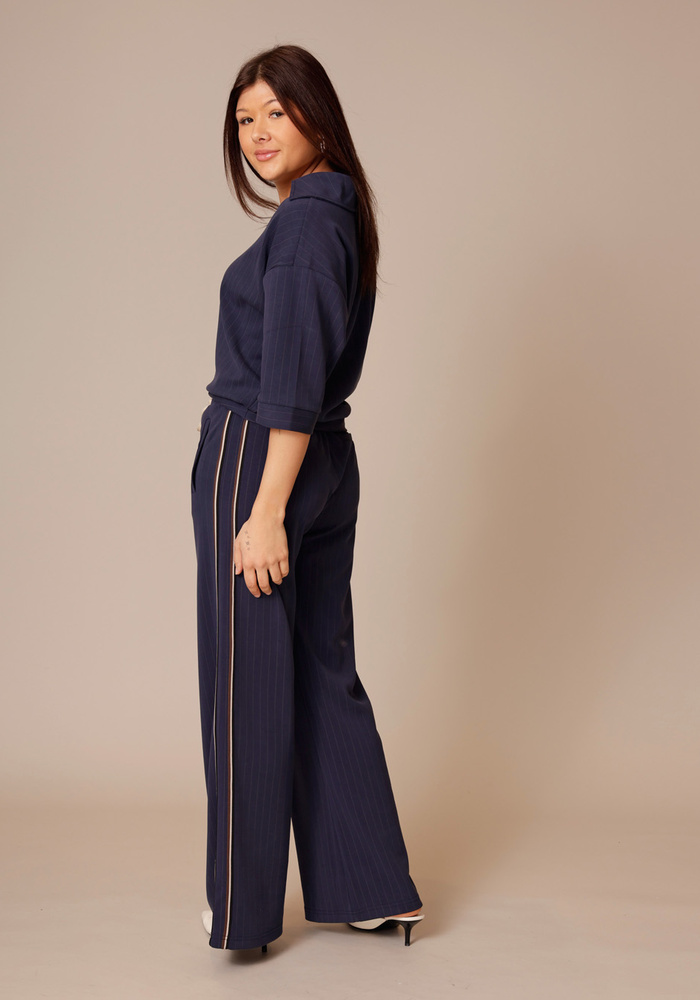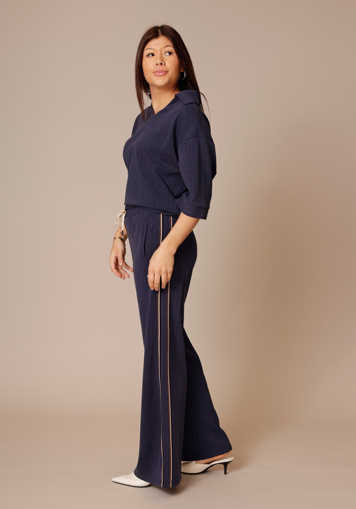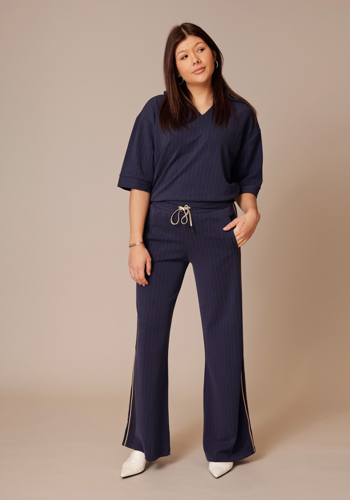 De Pinstripe trousers van Summum met een elastische tailleband en een contrasterend koord. Deze comfortabele broek is uitgevoerd met wijde pijpen en een sportieve bies langs de zijnaden.