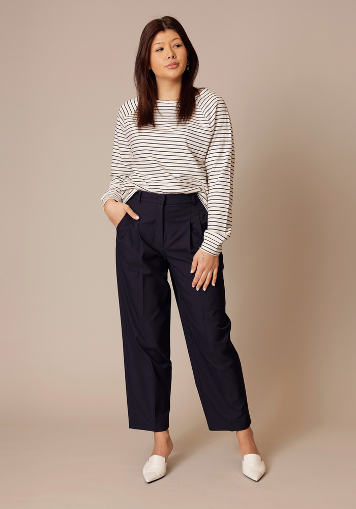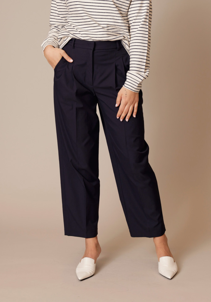 De Emilie trousers van Cambio hebben een hoge taille en taps toelopende pijpen voor een elegante, moderne uitstraling. Ze sluiten met een knoop, haakje en rits en zijn voorzien van steekzakken aan de zijkant en paspelzakken aan de achterkant.