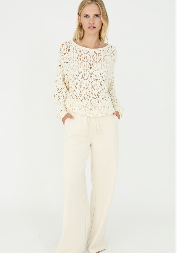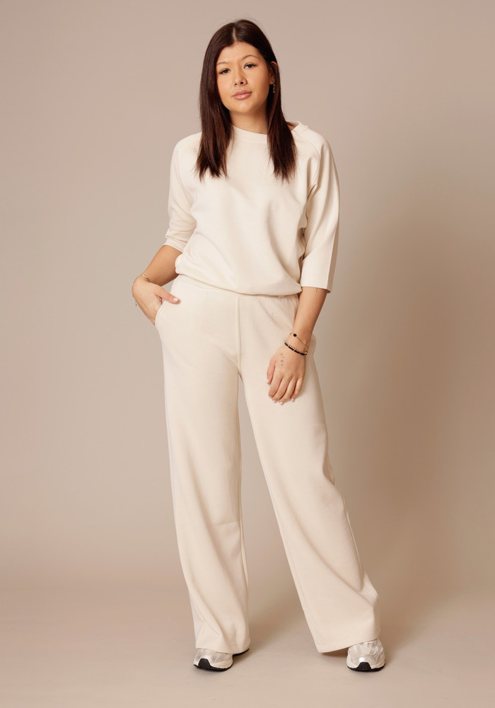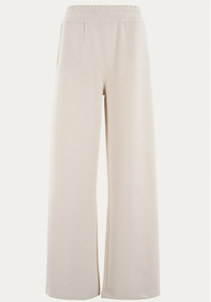 Deze broek van Moscow in de kleur flax combineert comfort met een elegante uitstraling. Het wide leg model en de soepel vallende stof geven de broek een verfijnde, vrouwelijke look. De elastische tailleband zorgt voor een comfortabele pasvorm en beweegt moeiteloos met je mee. Dankzij de mix van modal, polyester en elastaan voelt de stof zacht aan en valt hij mooi. Ideaal voor een ontspannen zomerse outfit, zowel casual als stijlvol te dragen.