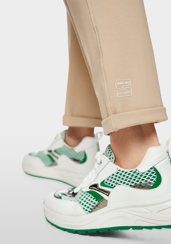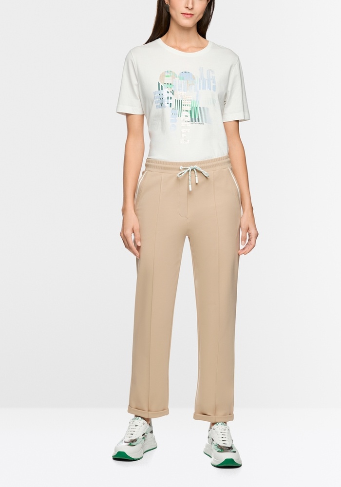 De broek FRIA pantalon van Marccain is uitgevoerd in een zachte katoenmix met modal en elastaan, heeft een vrouwelijke pasvorm en een normale taillehoogte. Smalle omslagen, gestikte persvouwen en een brede, sportieve elastische tailleband met trekkoord zorgen voor eigentijds draagcomfort. Schuine steekzakken met contrasterende details geven deze stijlvolle instapbroek een verfijnde finishing touch.