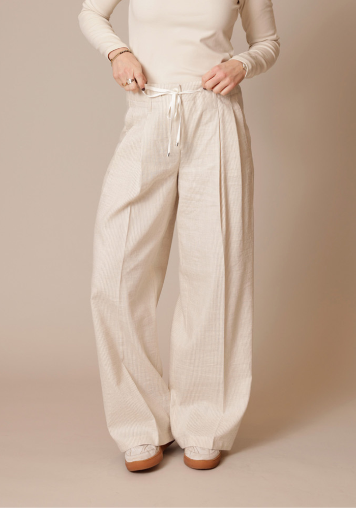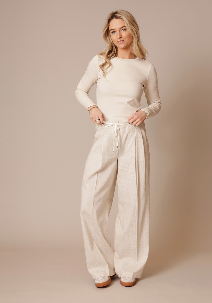 De Addison pants van Cambio is een pantalon met een wijde pasvorm. De broek heeft een knoop -en ritssluiting met ceintuur.