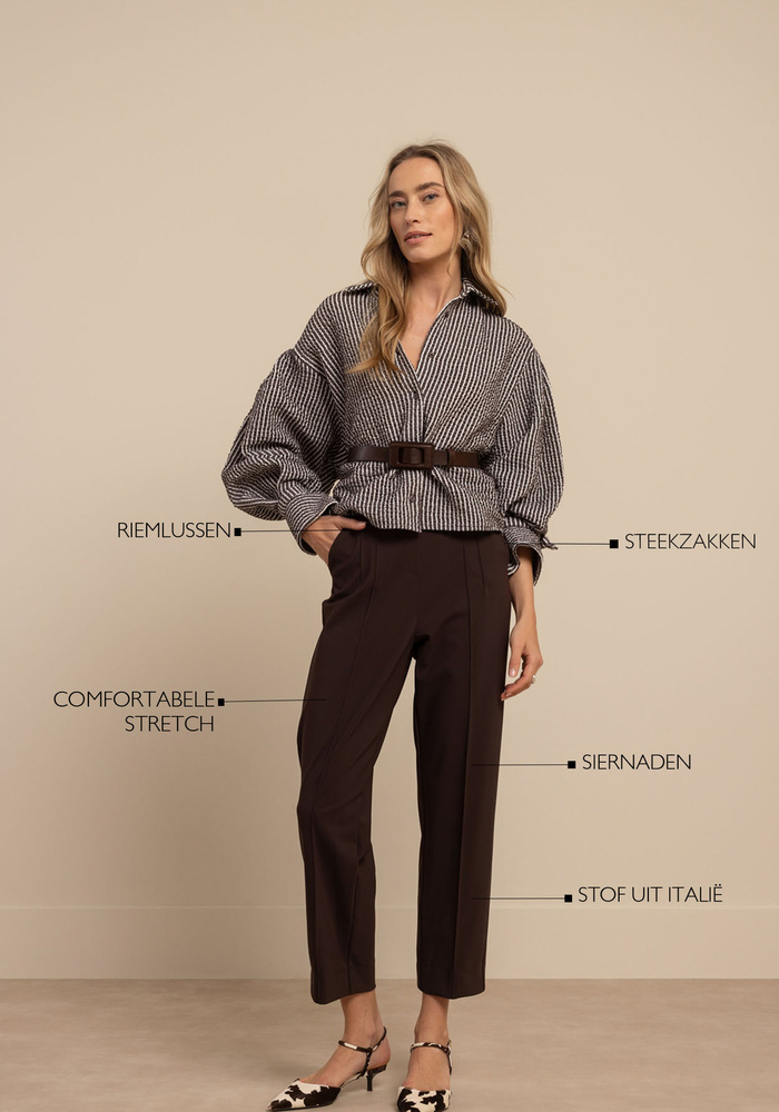 De Roisin bonded trousers van Studio Anneloes is een elegante broek met een comfortabele tapered fit. De diepe kleur Espresso zorgt voor een warme, luxe uitstraling. Dankzij de subtiele pintuck-siernaden en het stevige materiaal combineert deze broek moeiteloos stijl en draagcomfort.