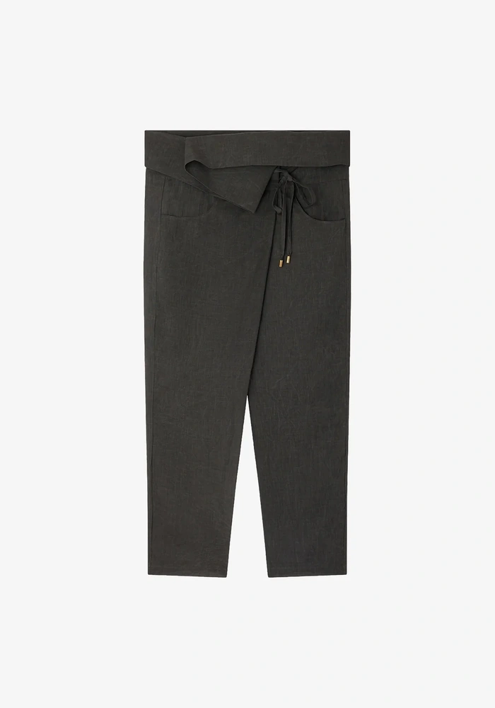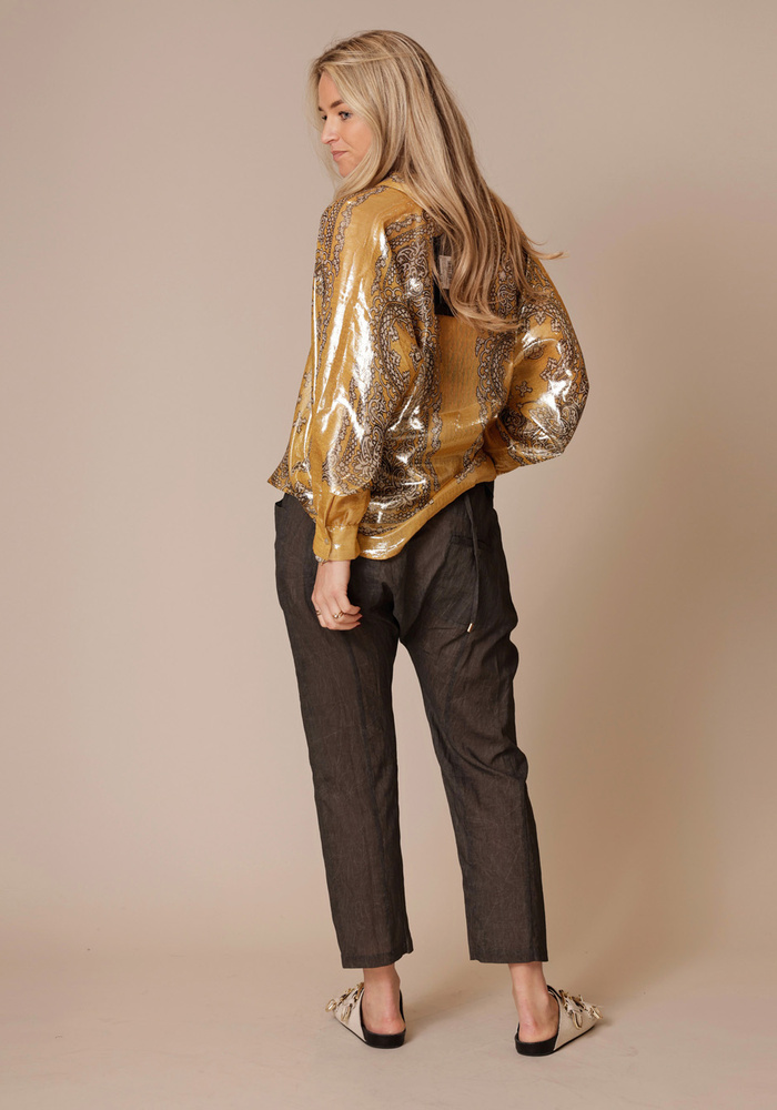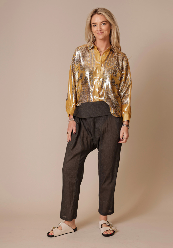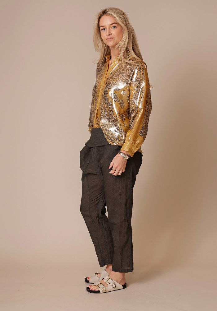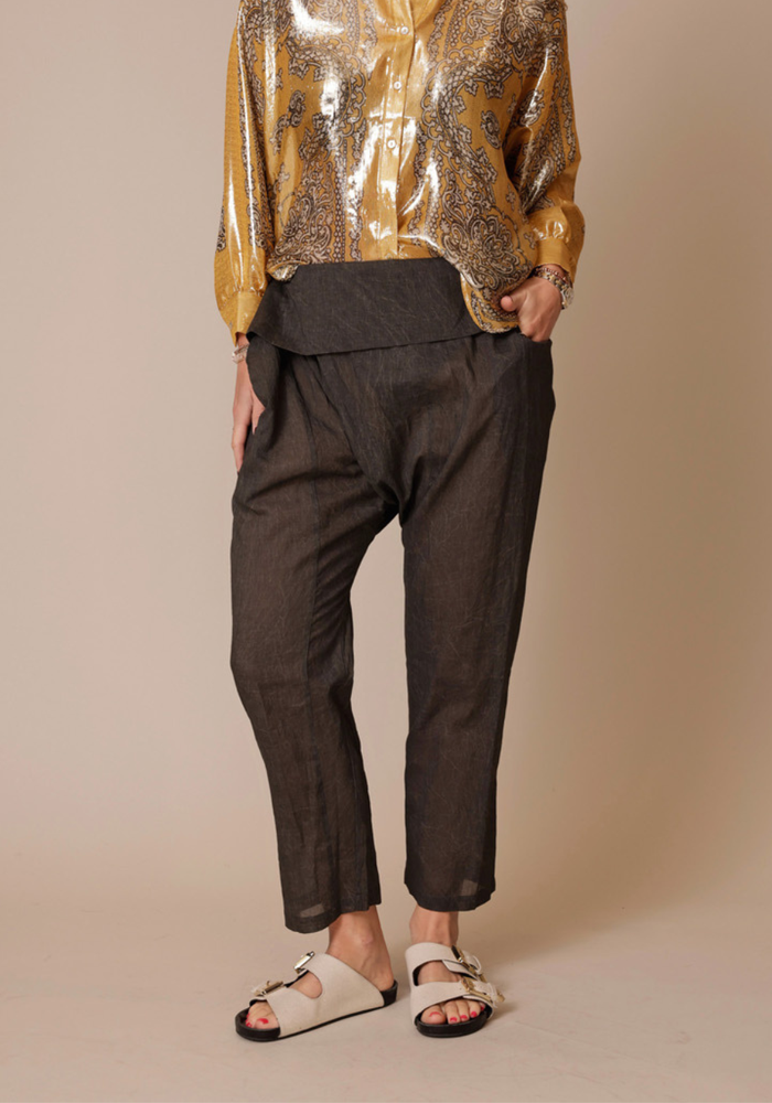 Broek van pigmentgeverfd katoen met een subtiel tie-dye effect en een losse, comfortabele pasvorm. De plooien vooraan en de taille met trekkoord en gouden details geven een moderne en verfijnde uitstraling.
