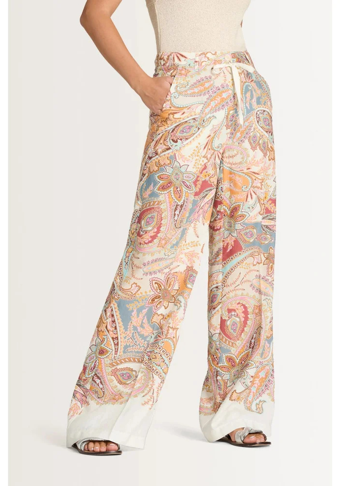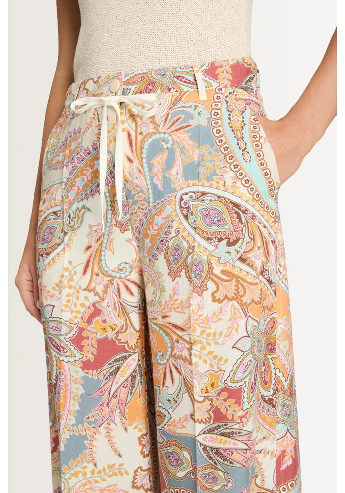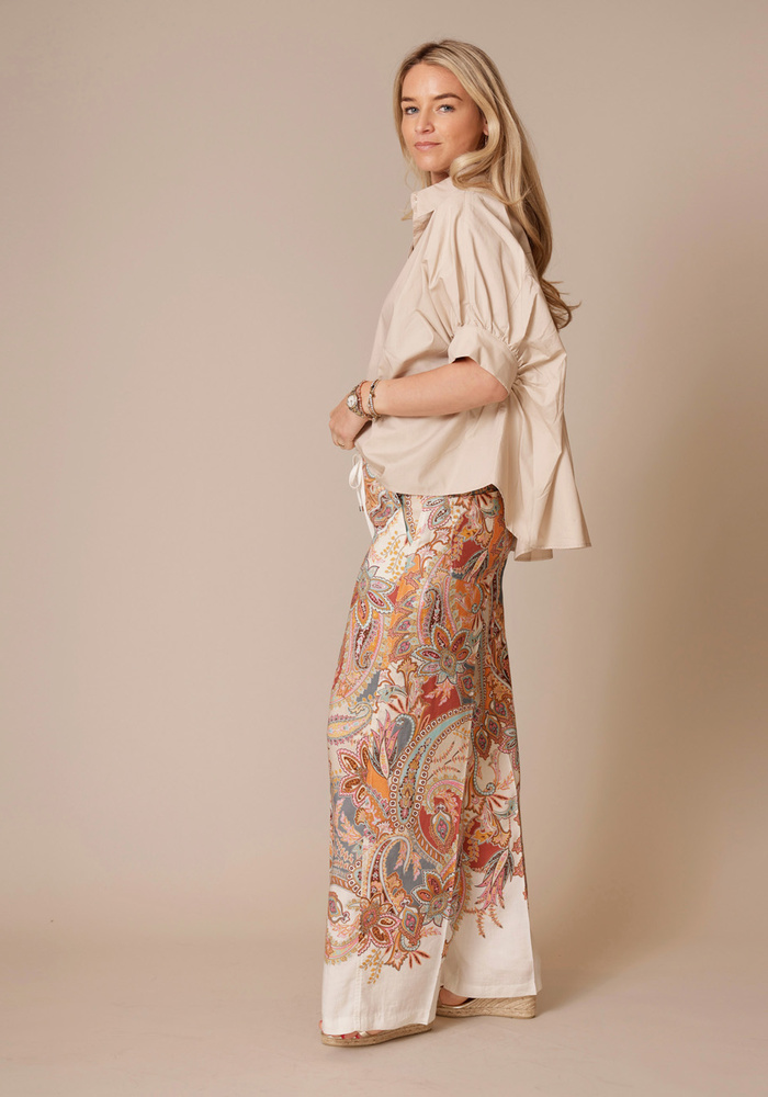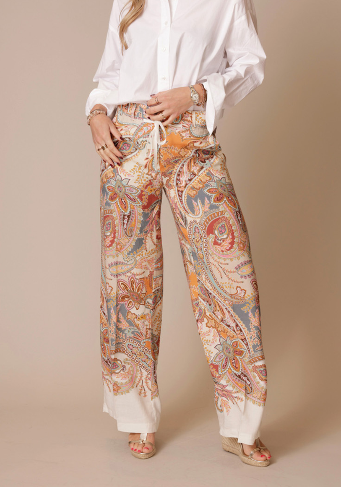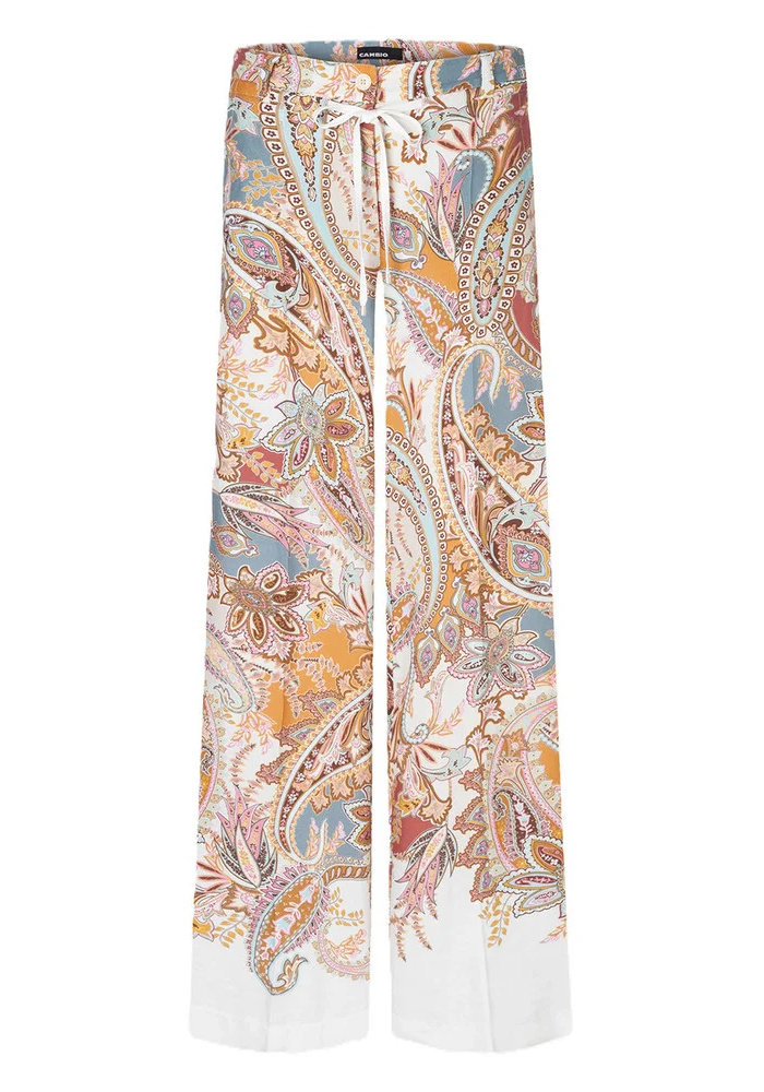 De Adrienne pantalon van Cambio is een multi color broek met elastiek en steekzakken.