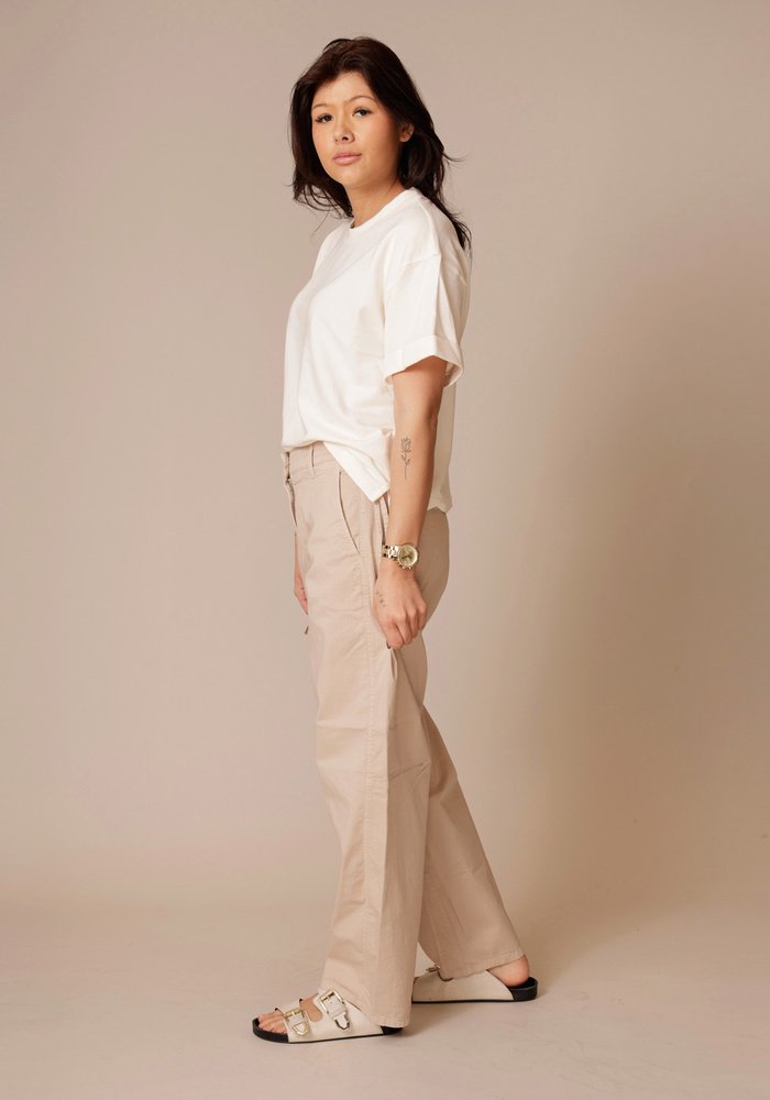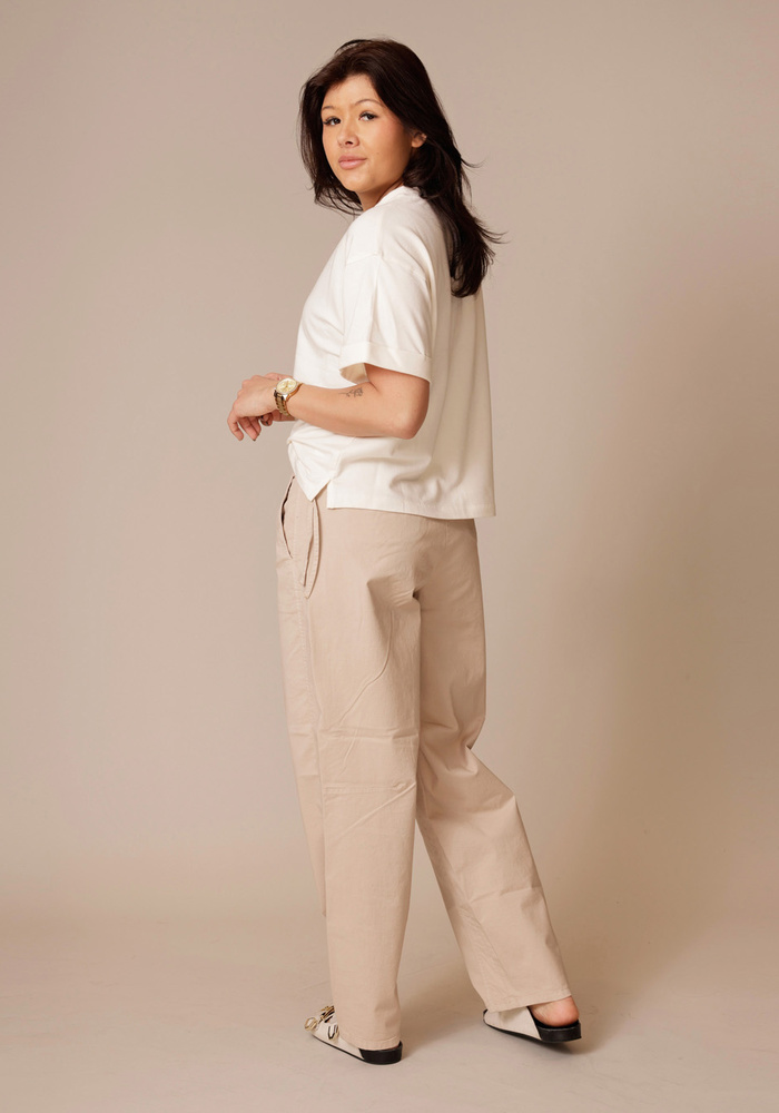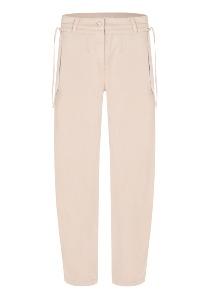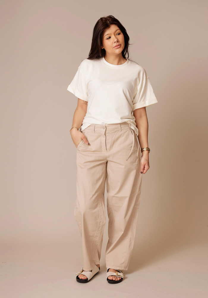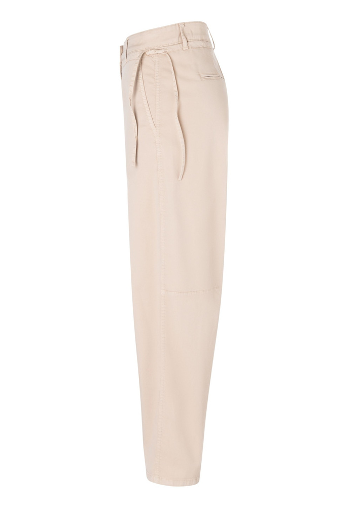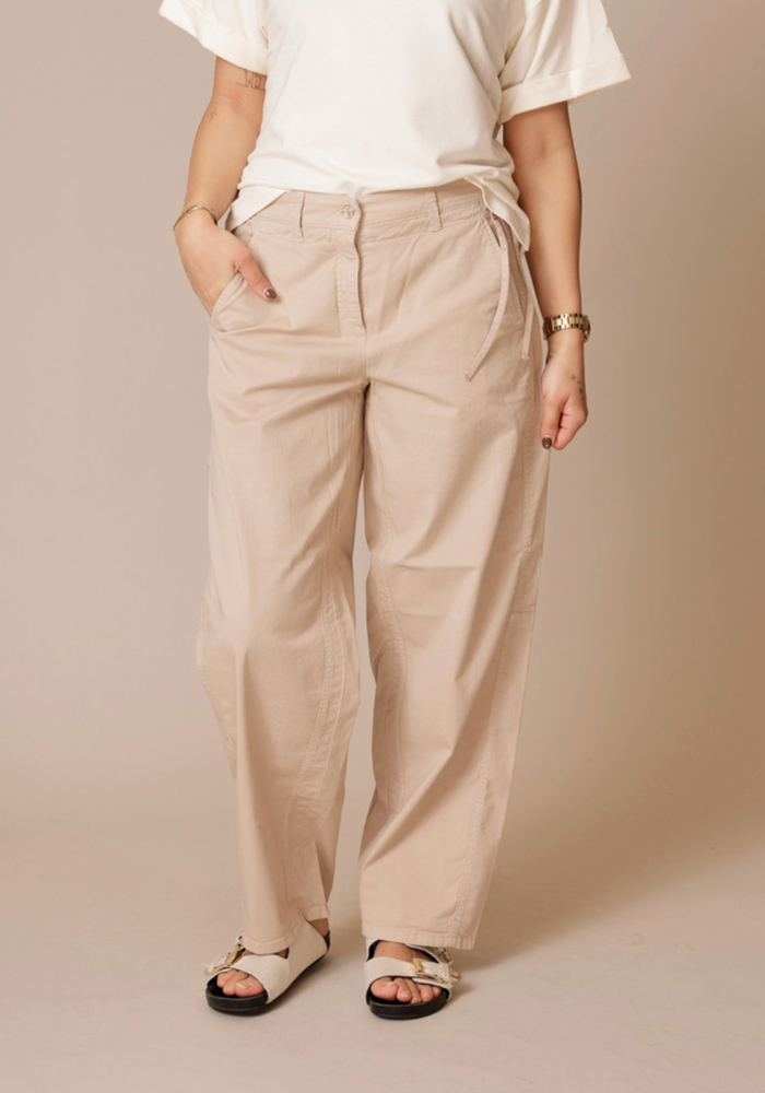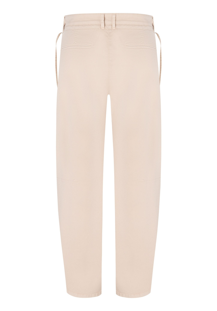 De O-Shape broek Olympia heeft een moderne, ontspannen pasvorm met een flatterende, volumineuze vorm. De comfortabele stretch gabardine, strikkoorden en lichte khaki kleur zorgen voor een stijlvolle zomerse look.