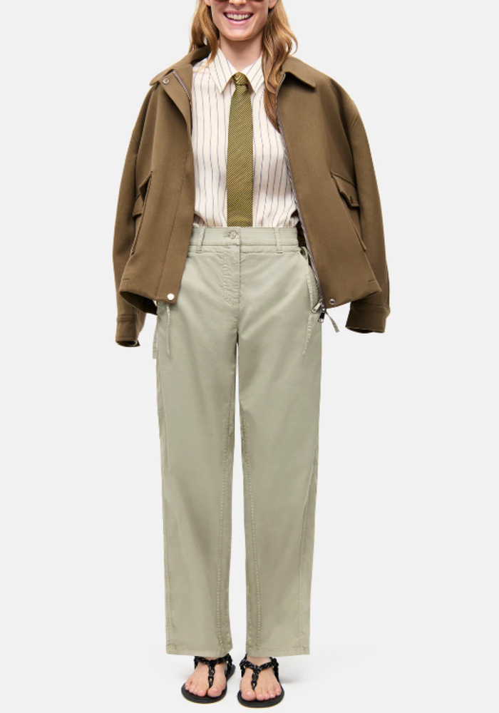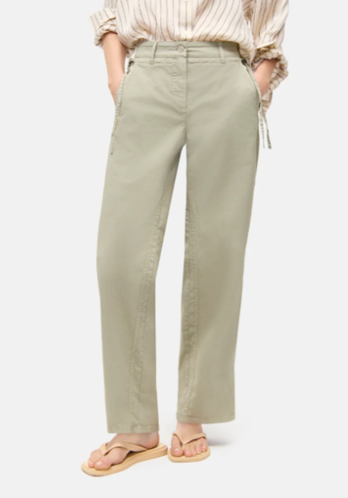De O-Shape broek Olympia heeft een moderne, ontspannen pasvorm met een flatterende, volumineuze vorm. De comfortabele stretch gabardine, strikkoorden en lichte khaki kleur zorgen voor een stijlvolle zomerse look.
