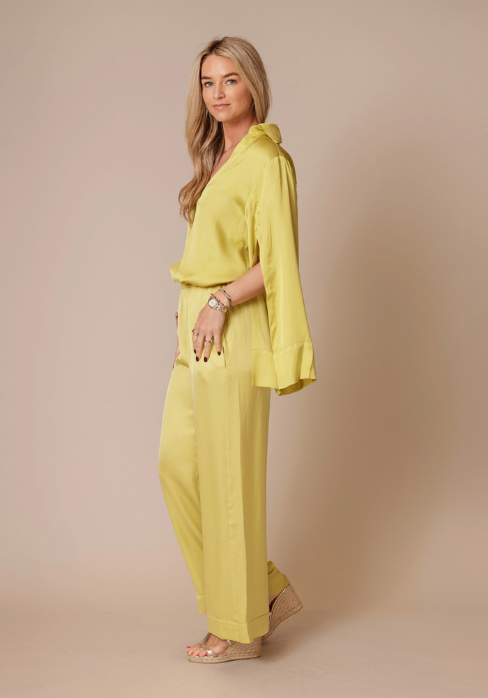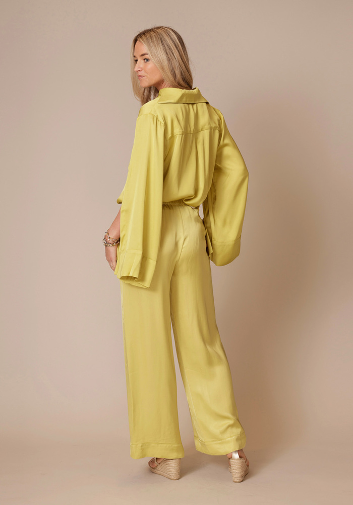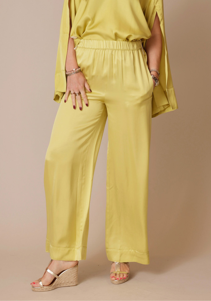 Deze prachtige broek van Nema heeft elastieke band met wijde pijpen. Combineer met de bijpassende blouse.