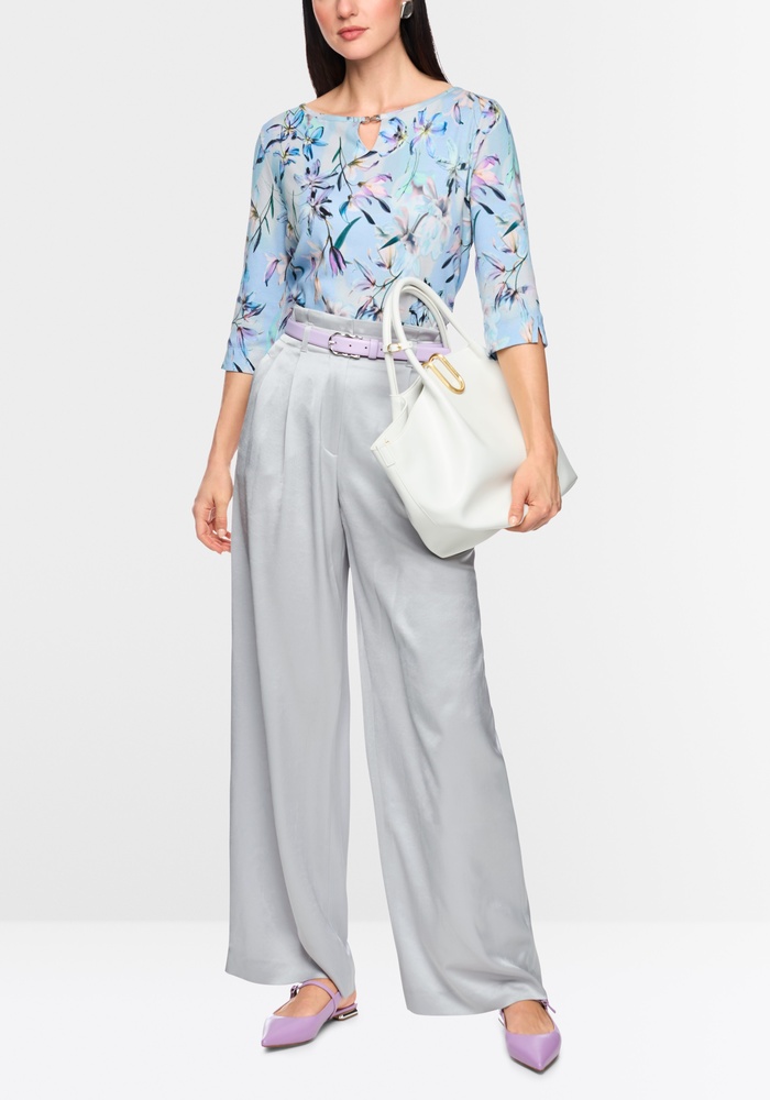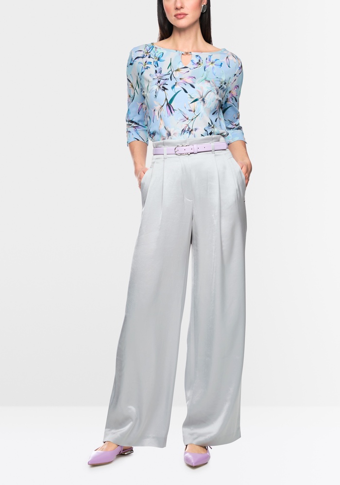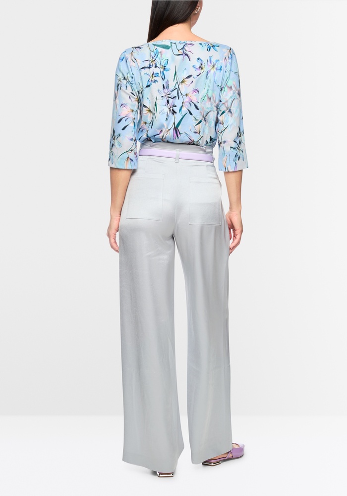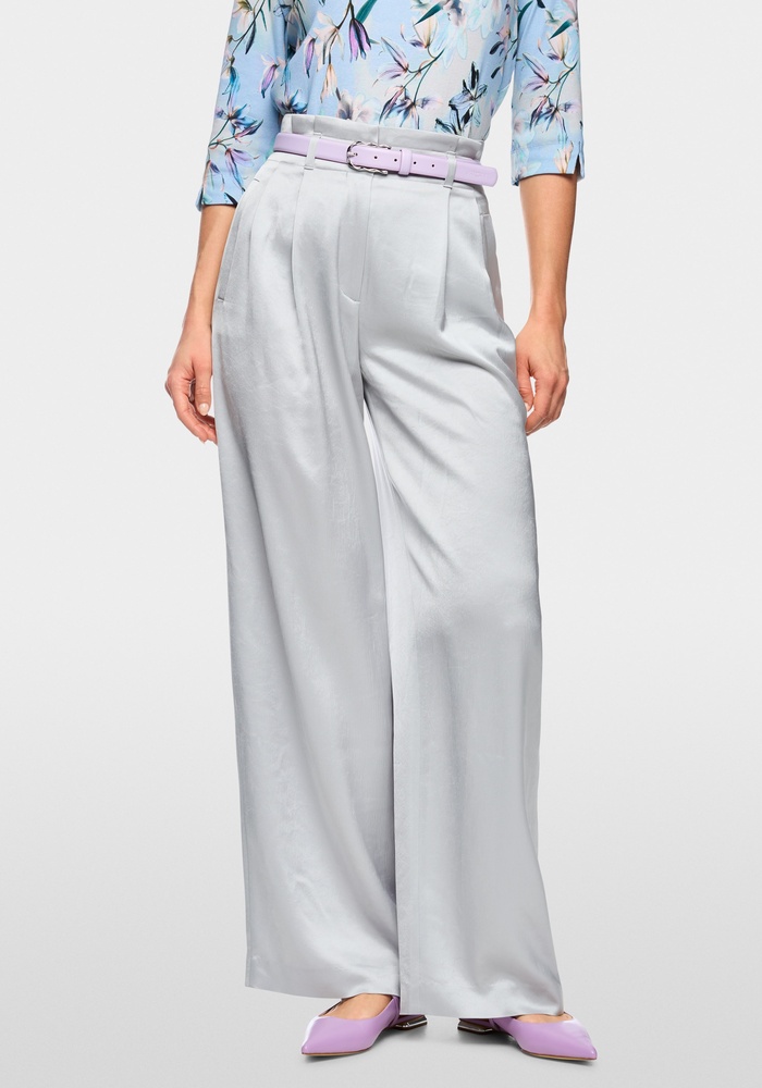 De broek Wichita van Marccain heeft een wijde pasvorm met een hoge taille. De plooien en de subtiele paperbag-taille zorgen voor een vrouwelijk silhouet. Het zacht vallende materiaal van acetaat en polyester zorgt voor een elegante satijnglans. De broek is aangenaam licht om te dragen en ideaal voor elegante looks voor dagelijks gebruik of voor speciale gelegenheden.
