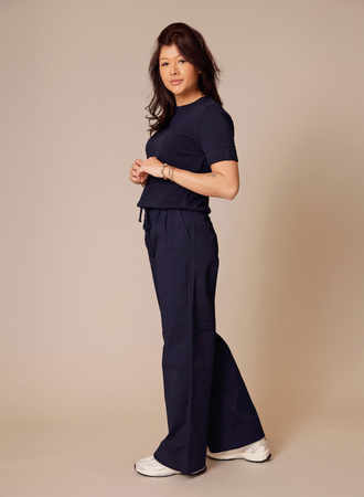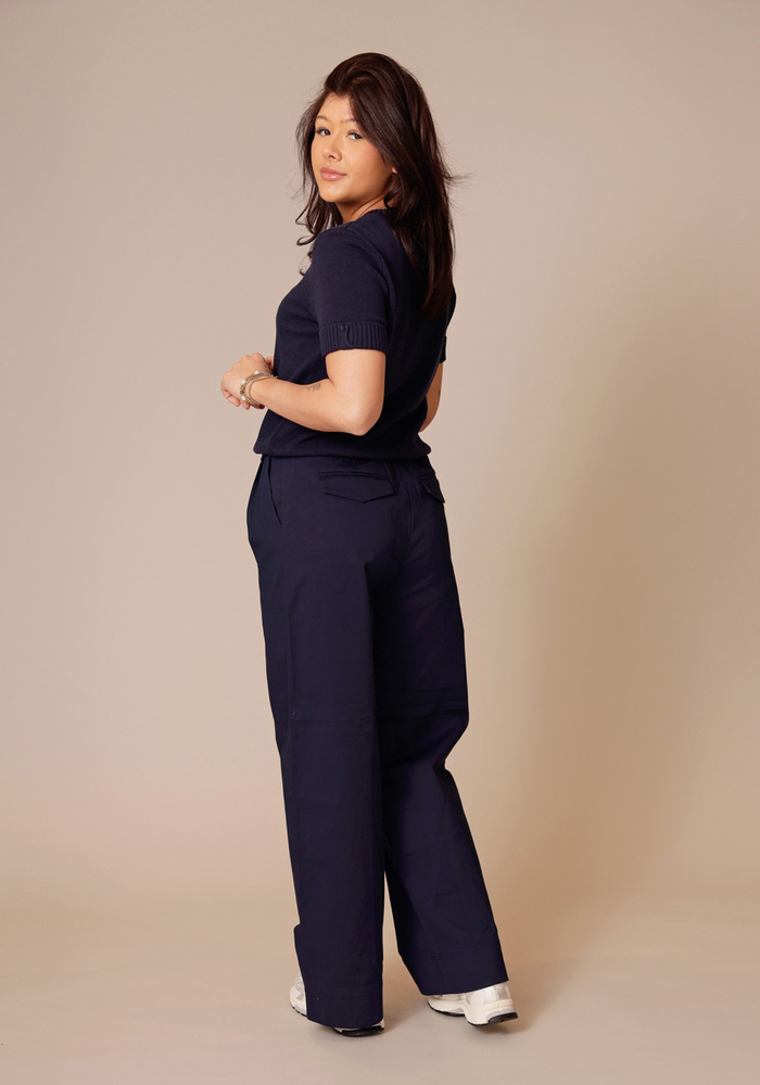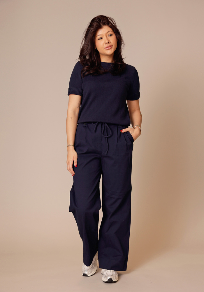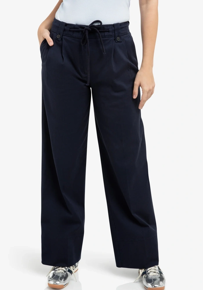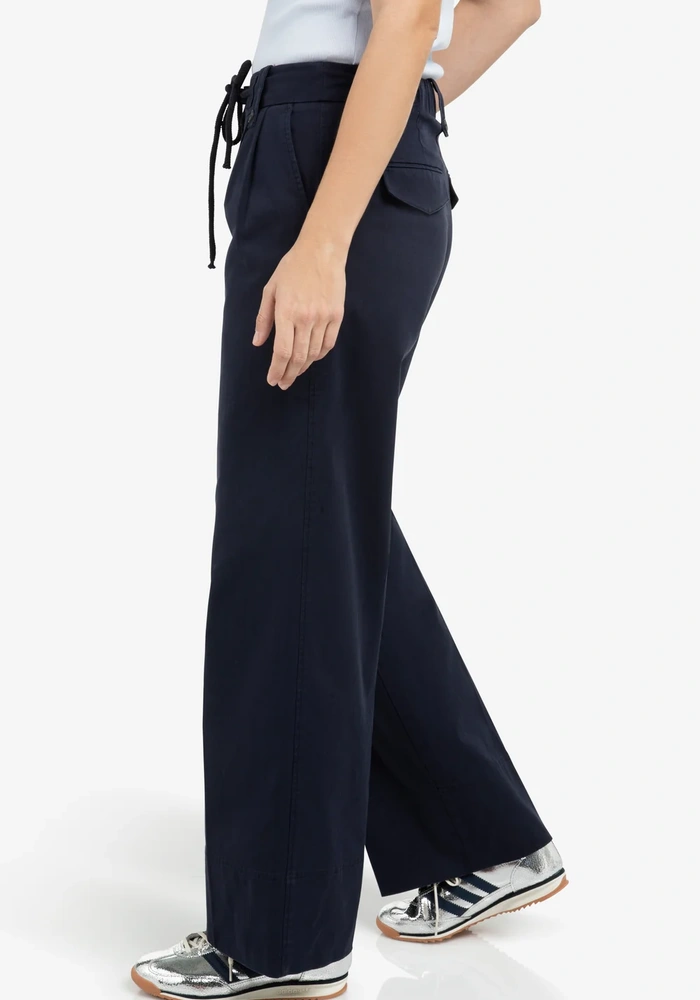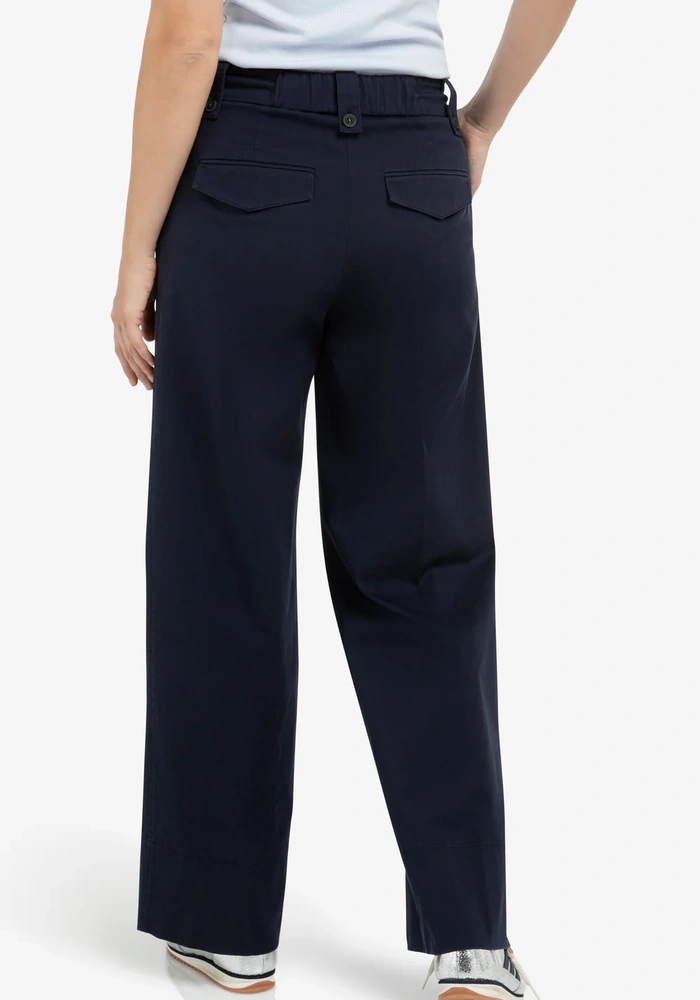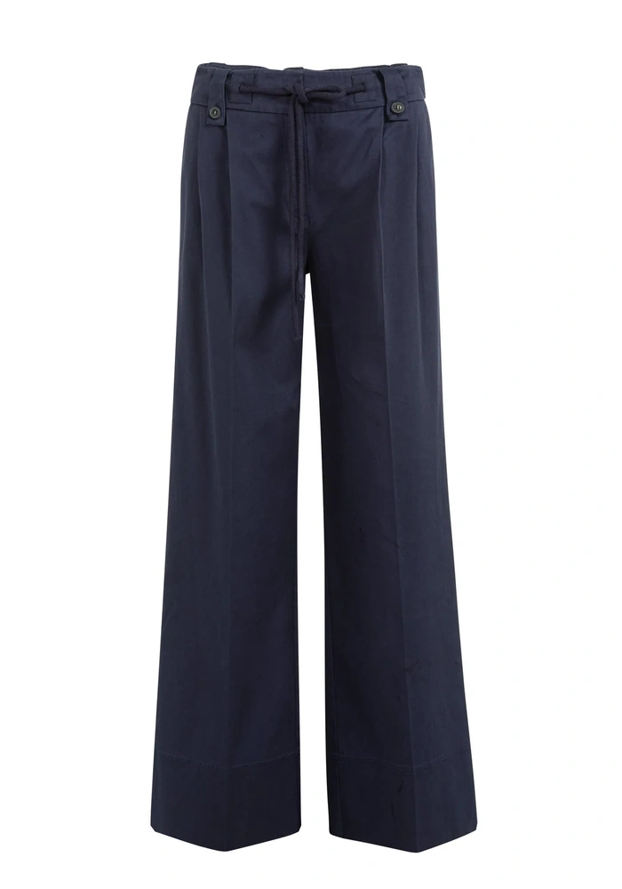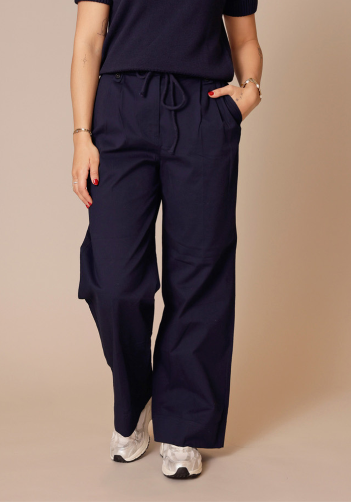 Deze comfortabele broek is uitgevoerd in een soepele geweven stof en heeft een hoge taille met elastische band en een strikkoord met metalen details. De wijde pijpen en de plooien aan de voorzijde geven het ontwerp een luchtige, vrouwelijke uitstraling. Steekzakken en paspelzakken aan de achterkant zorgen voor een praktische en nette afwerking. Perfect voor een relaxte, maar toch verzorgde look.