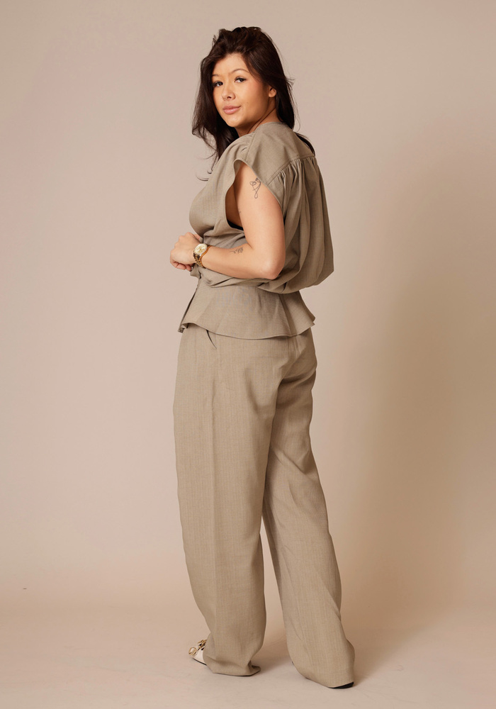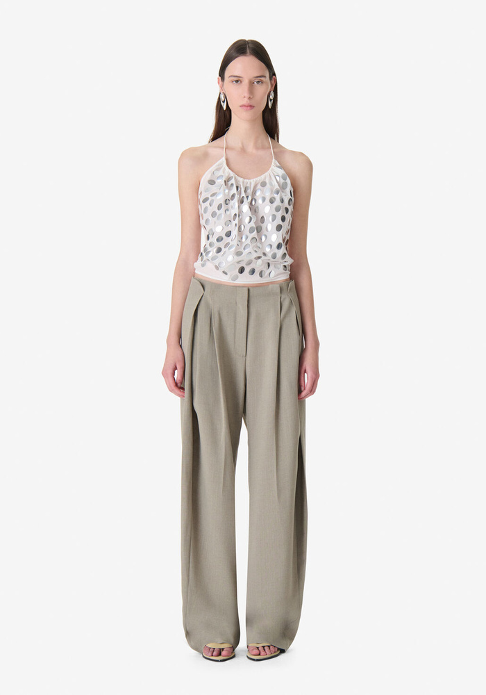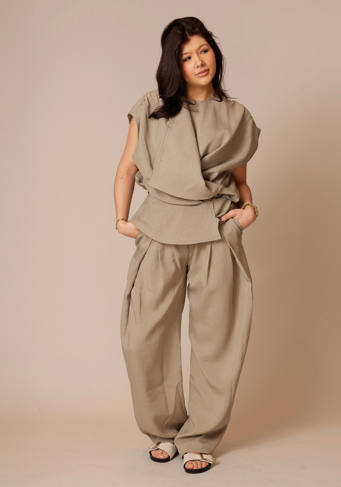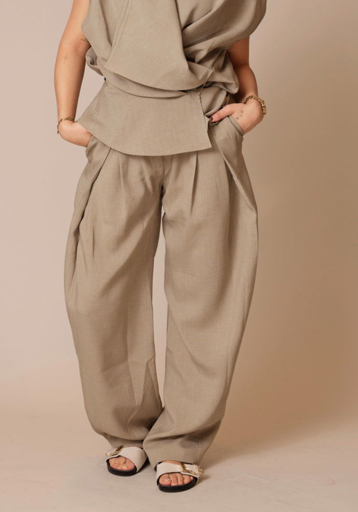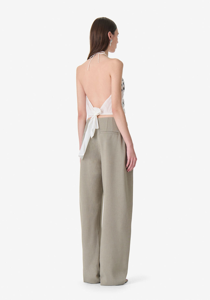 De Sonja pant van Iro is een geplooide broek met wijde pijpen. Ruim volume gedefinieerd door diepe voorplooien. Zijzakken en achterzakken.