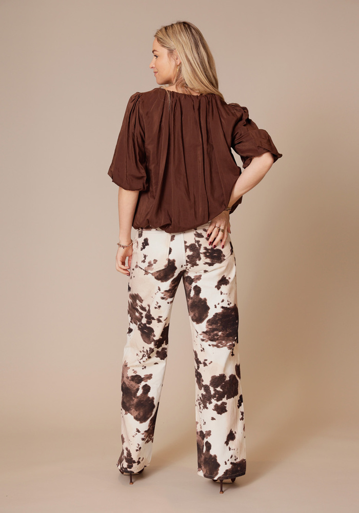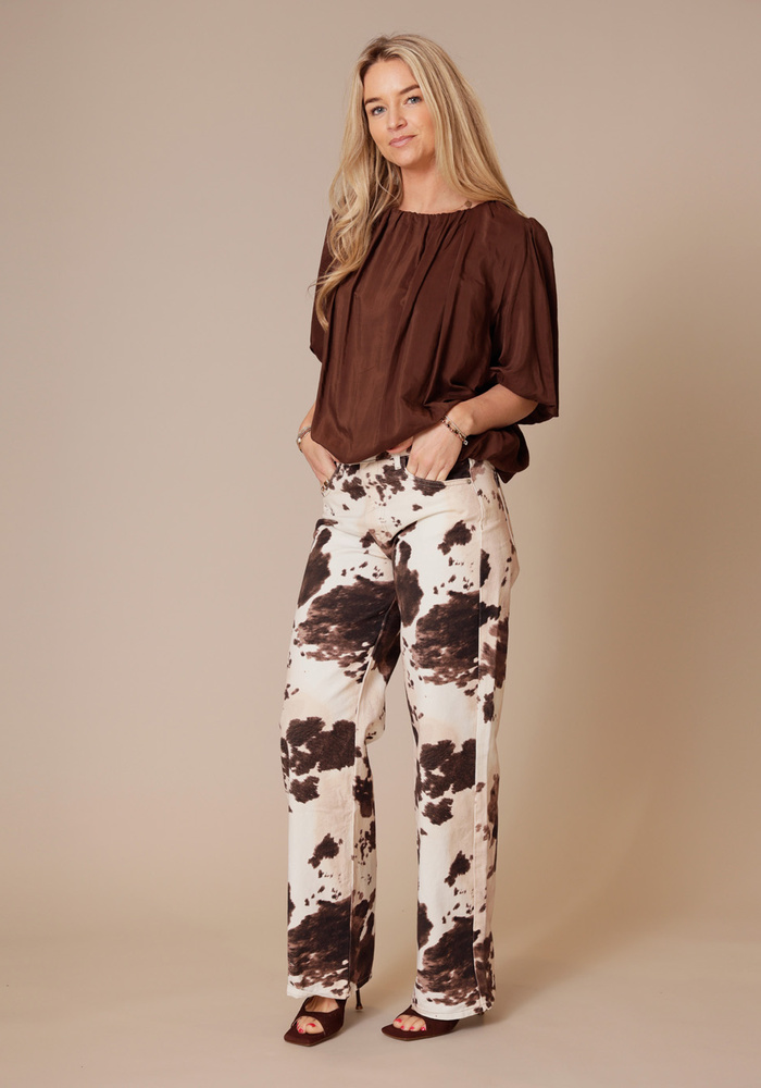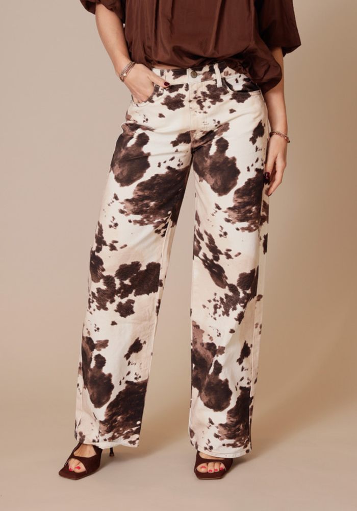 De Summum Cowbaggy 5-pocket broek is gemaakt van 100% katoen in een zachte twillkwaliteit met een opvallende allover cowprint. De broek heeft een hoge taille en een baggy straight fit voor een relaxte, moderne look.