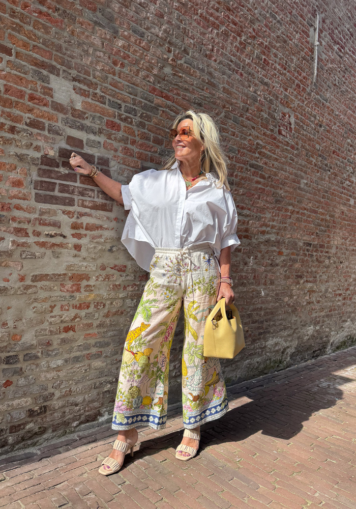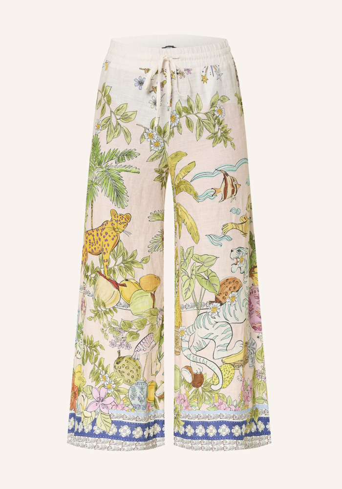 Een high-rise broek met een comfortabele elastische tailleband en verstelbaar trekkoord, uitgevoerd in een luchtige linnen kwaliteit met een subtiele korrelstructuur. De cropped, wide leg pasvorm en all-over print zorgen voor een moeiteloos stijlvolle en zomerse uitstraling