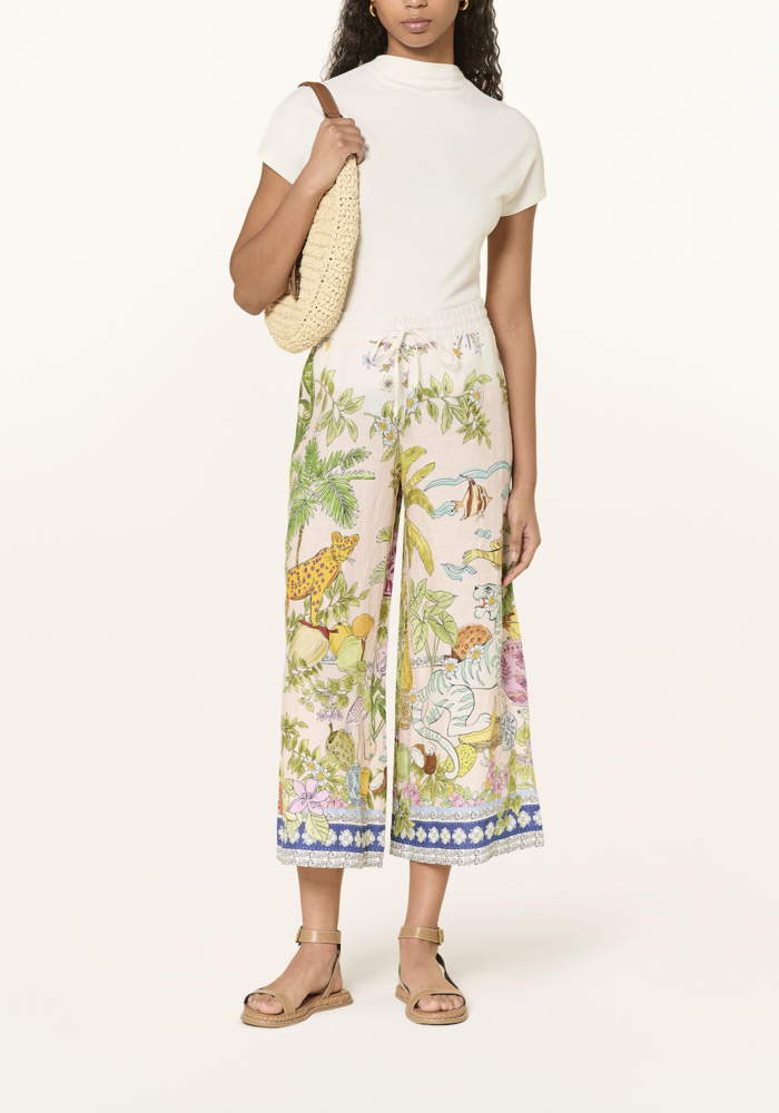 Een high-rise broek met een comfortabele elastische tailleband en verstelbaar trekkoord, uitgevoerd in een luchtige linnen kwaliteit met een subtiele korrelstructuur. De cropped, wide leg pasvorm en all-over print zorgen voor een moeiteloos stijlvolle en zomerse uitstraling
