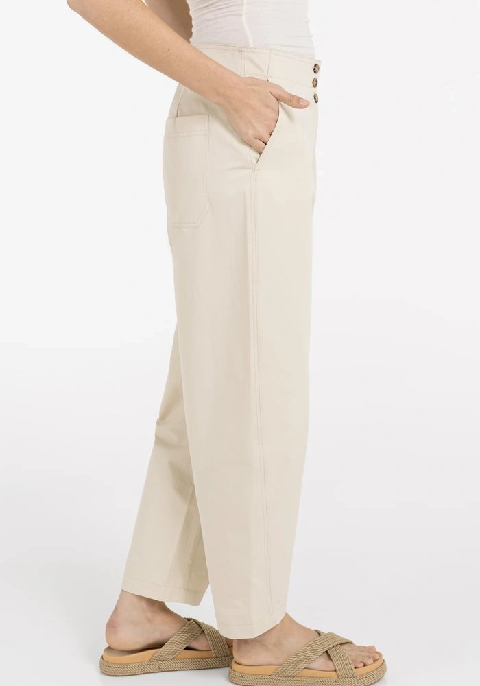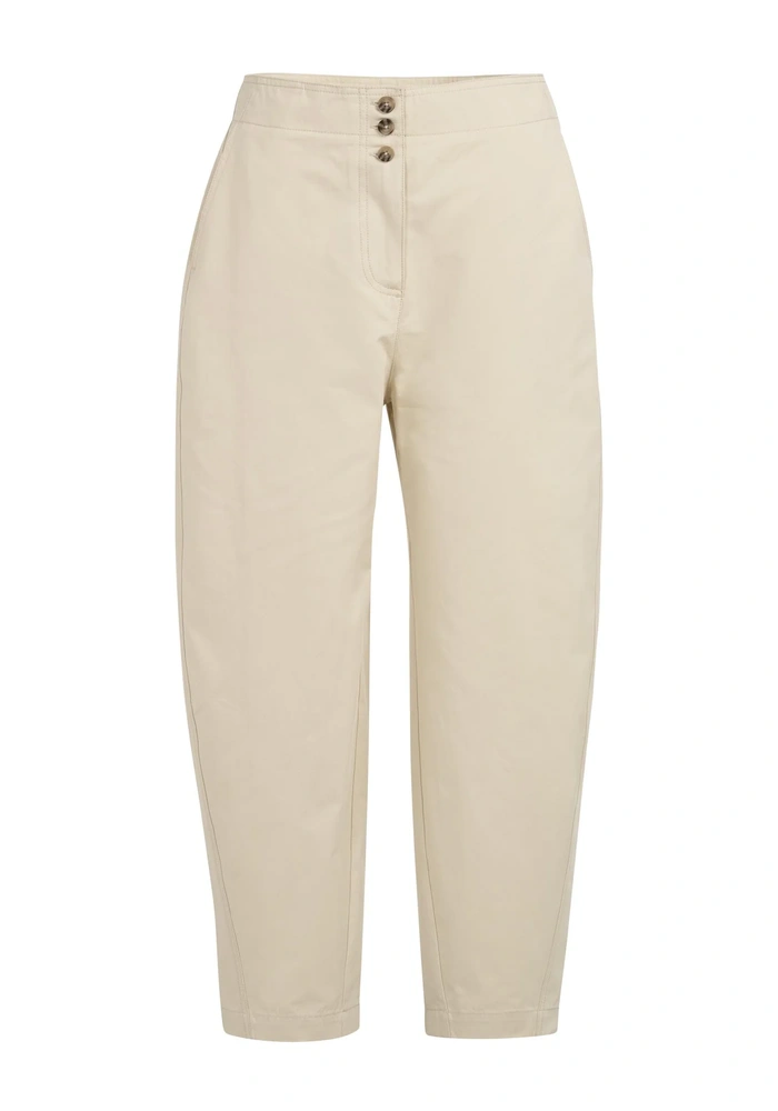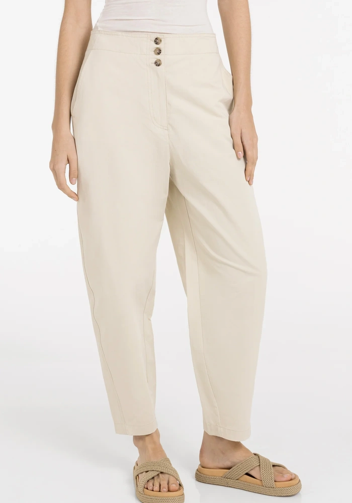 Deze Barrel broek van Yaya is een high waist model gemaakt van een zachte, glad geweven stof. Hij heeft een relaxed barrel leg silhouet dat subtiel taps toeloopt naar de enkels, en is voorzien van handige steekzakken, opgestikte achterzakken en een speels knoopdetail in de tailleband. De broek biedt een comfortabele en moderne pasvorm, ideaal voor een stijlvolle en moeiteloze dagelijkse look.