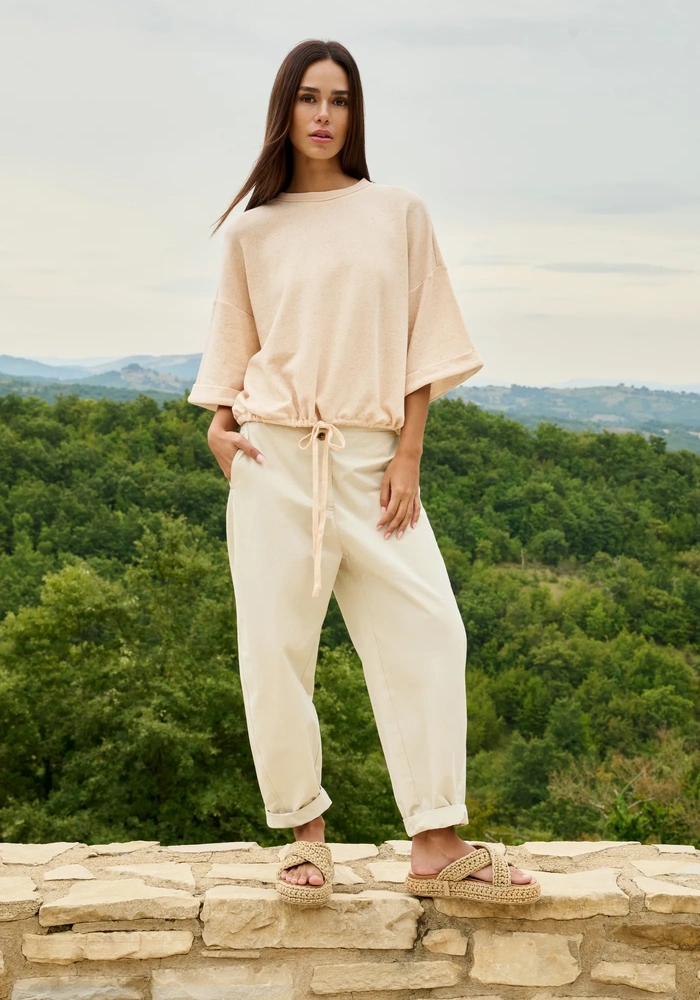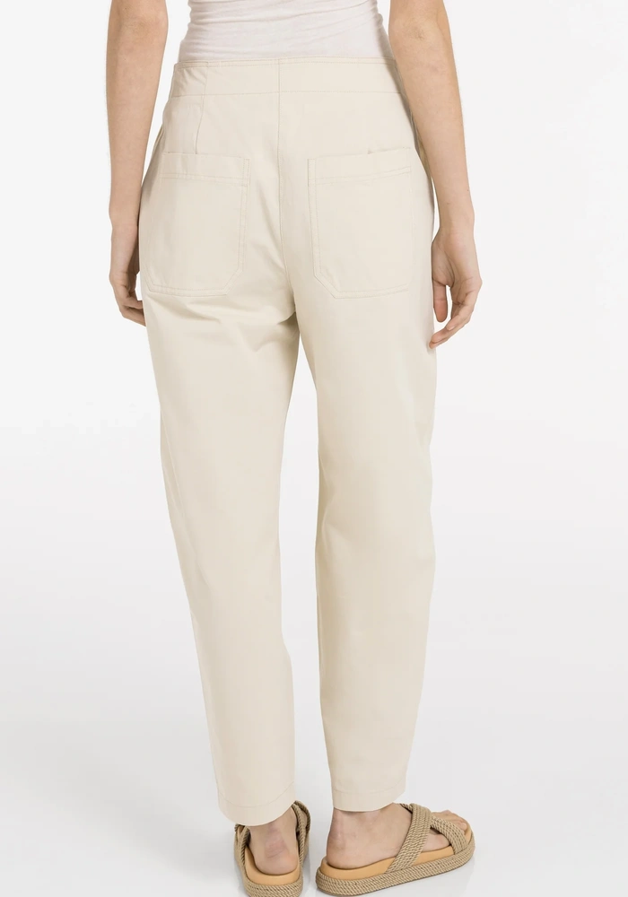 Deze Barrel broek van Yaya is een high waist model gemaakt van een zachte, glad geweven stof. Hij heeft een relaxed barrel leg silhouet dat subtiel taps toeloopt naar de enkels, en is voorzien van handige steekzakken, opgestikte achterzakken en een speels knoopdetail in de tailleband. De broek biedt een comfortabele en moderne pasvorm, ideaal voor een stijlvolle en moeiteloze dagelijkse look.