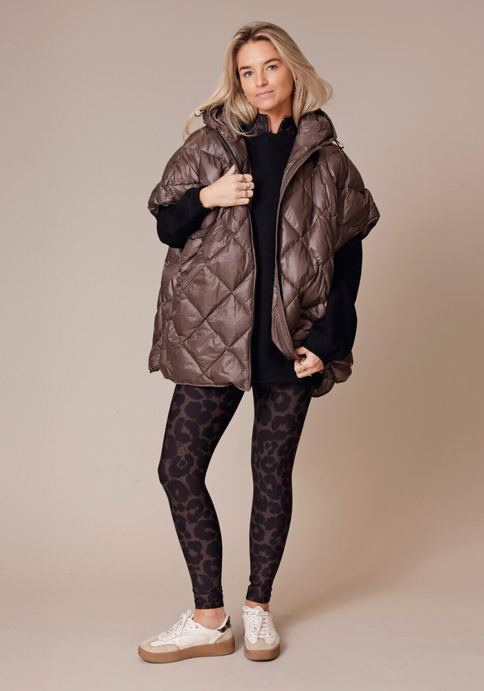 De Carice cape van Deblon is een oversized bodywarmer die over de kont valt. De bodywarmer heeft een capuchon, een ritssluiting aan de voorzijde en knoopjes aan de zijkant.