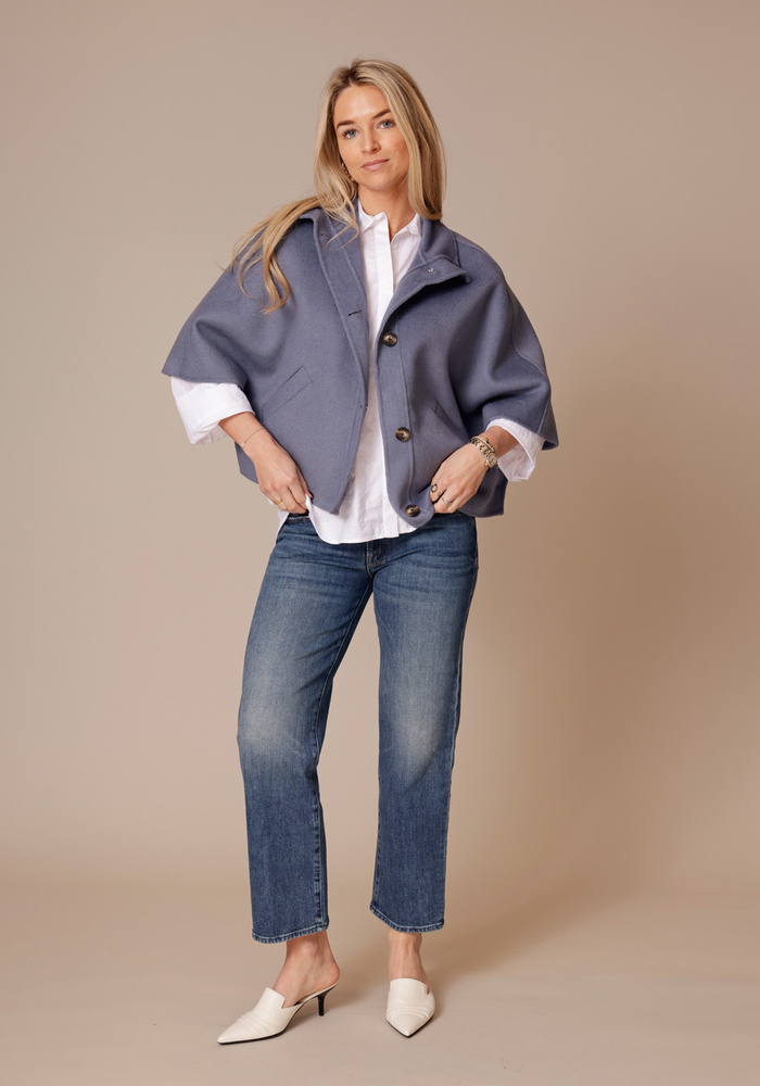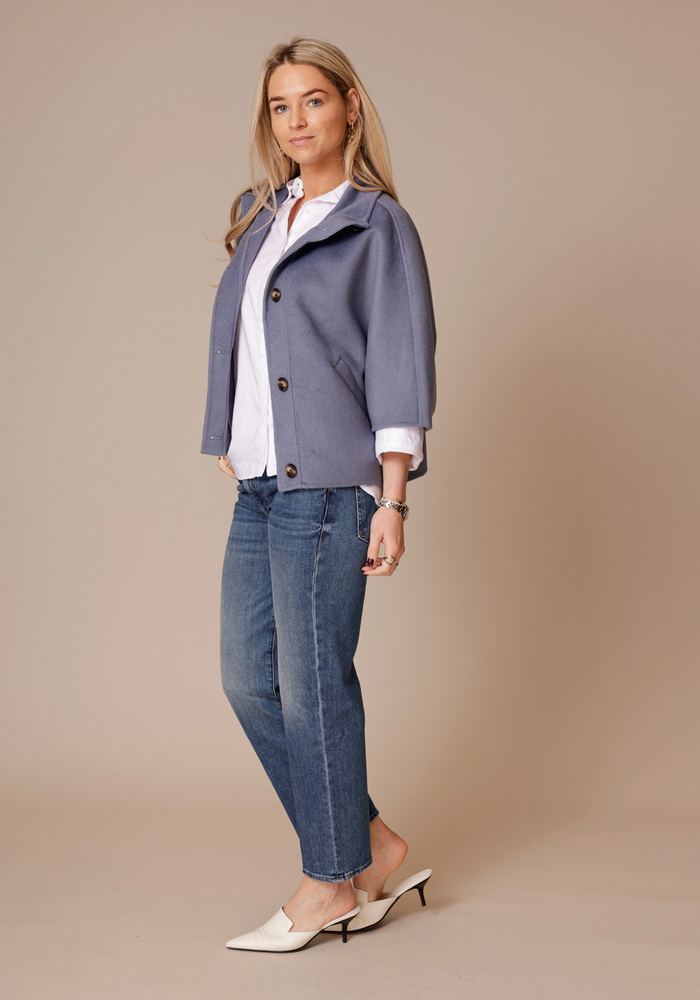 De Liv coat van Alter Ego is een oversized jasje met halflange mouwen. Het jasje heeft een knoopsluiting aan de voorzijde.