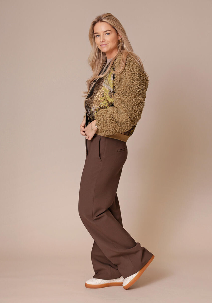 Jacquard Summum bomber met opvallend patroon en teddy mouwen. Licht gewatteerd, met satijnen voering en zachte ribboorden – ideaal als tussenjas of indoor jacket.