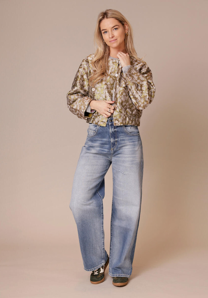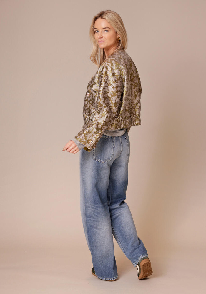 Boxy Summum jasje van glanzende jacquard met bladerpatroon, fancy knopen en elastische boord voor een subtiel bol silhouet. Volledig gevoerd met een glanzende binnenkant.