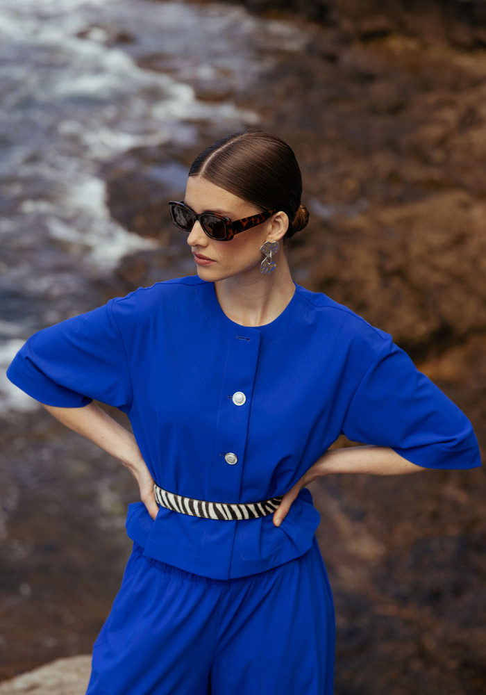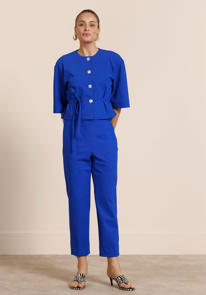 De Nada jacket van Studio Anneloes is een stijlvol jasje in de krachtige kleur Electric Blue met een moderne, vrouwelijke uitstraling. Dankzij de stevige Heavy Travelstof, regular fit en het bijpassende ceintuur biedt het jasje zowel comfort als een elegante pasvorm.