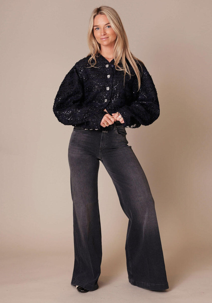 De Boucle short jacket van Rotate is een kort jasje met volumineuze mouwen. Het jasje heeft een ronde hals en een knoopsluiting aan de voorzijde.