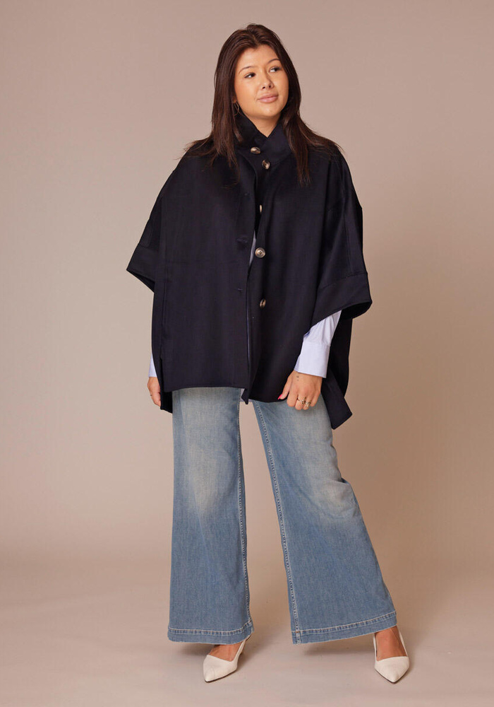 De Ivy coat van Alter Ego is een oversized jas met halflange mouwen. De jas heeft een knoopsluiting aan de voorzijde en een opstaande kraag.
