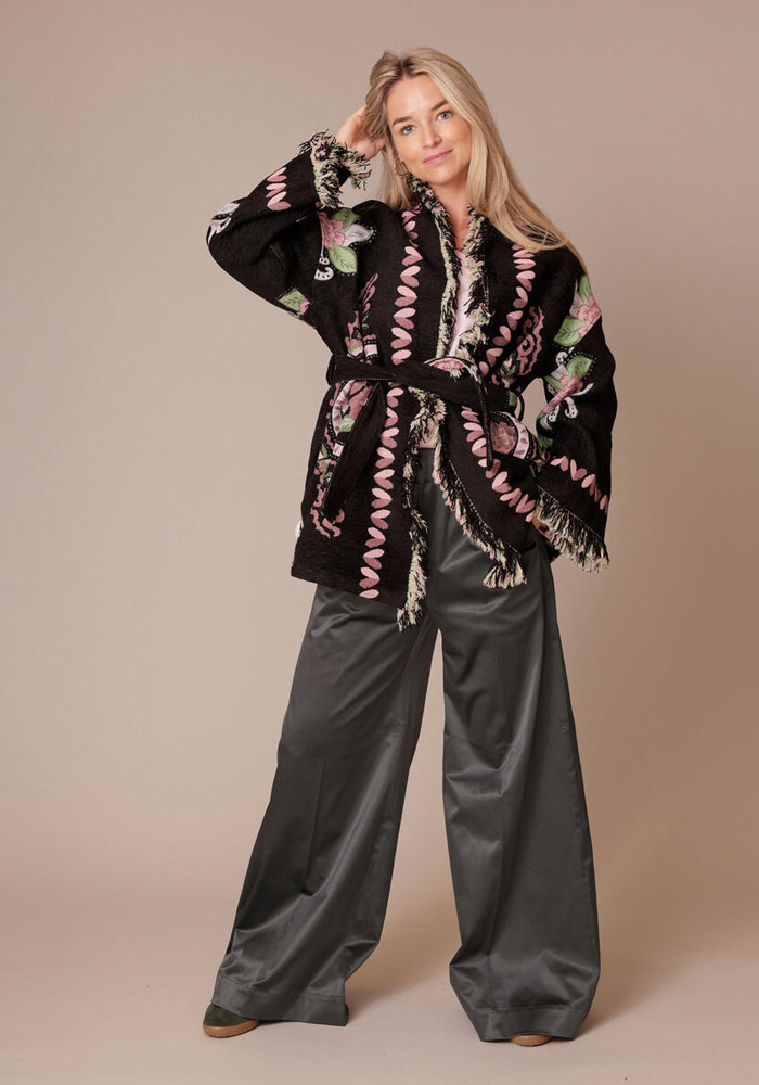 Deze jacket van Nema is een echte eye-catcher. Het jasje valt oversized en heeft een bijpassend ceintuur.