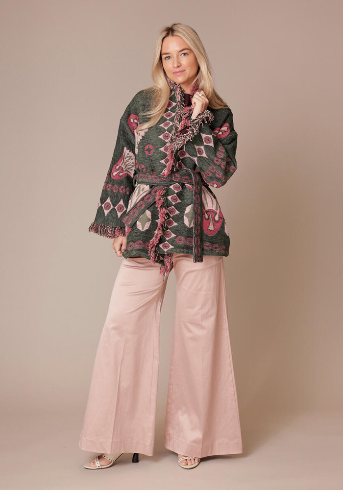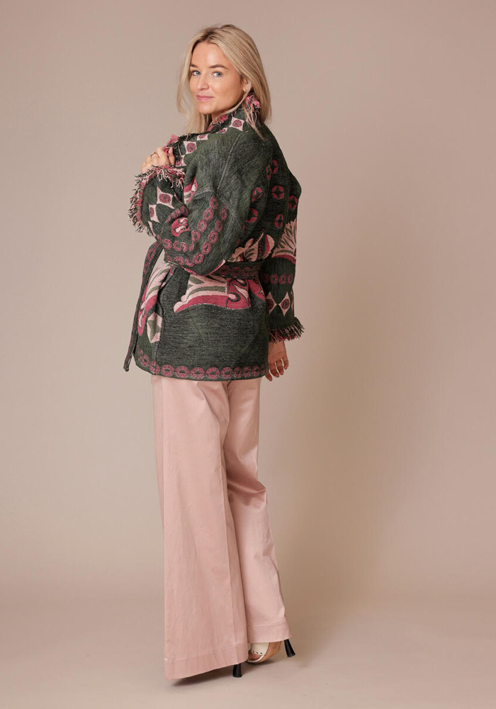 Deze jacket van Nema is een echte eye-catcher. Het jasje valt oversized en heeft een bijpassend ceintuur.