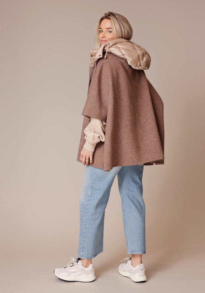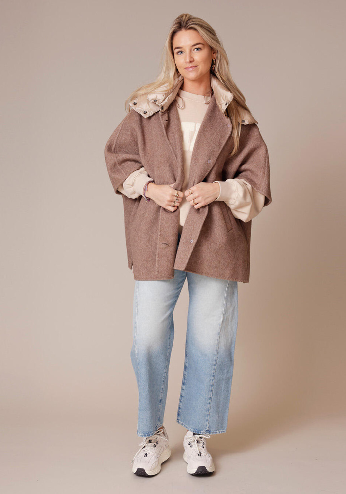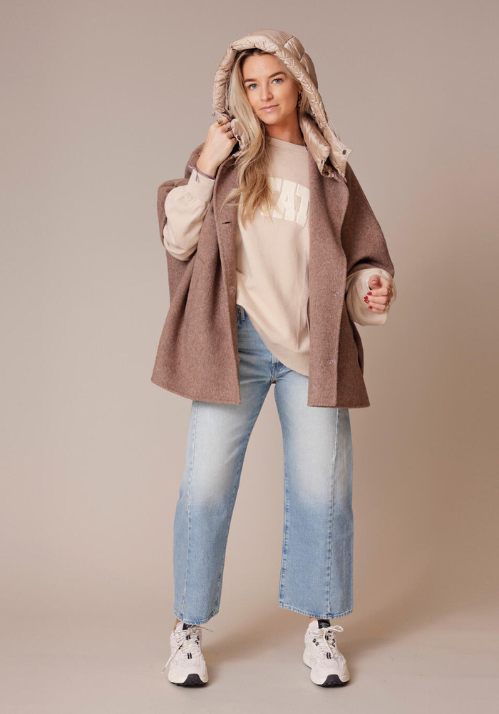 Deze stijlvolle Bomboogie jas combineert comfort en elegantie met een moderne, casual uitstraling. De jas heeft een warme, gevoerde capuchon en is gemaakt van een zachte wolblend die perfect is voor koele dagen. Dankzij de neutrale beige- en bruintinten is hij moeiteloos te combineren met elke outfit, van jeans tot jurken.