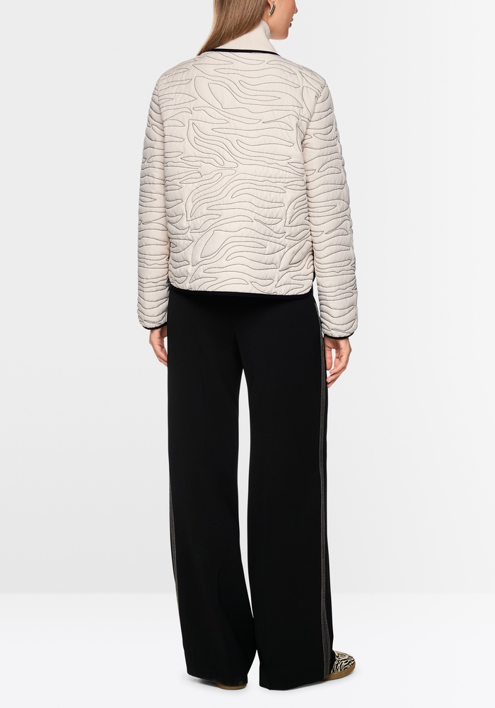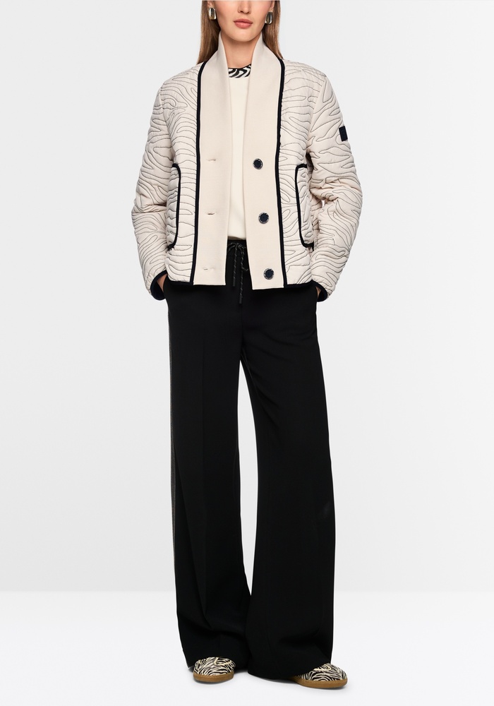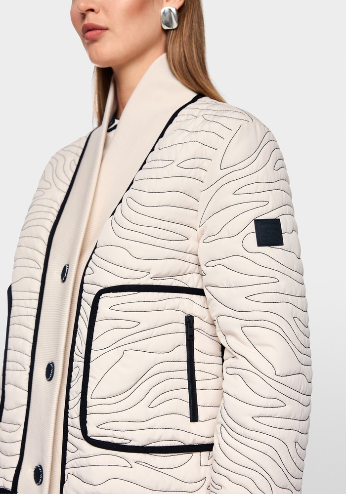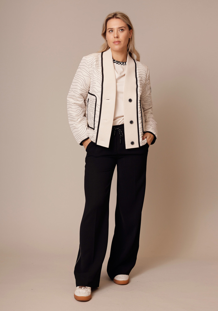Deze outdoor jack van Marcaain heeft bijzondere, golvende stiksels met zwarte naden dit maken de jas tot een echte blikvanger. Hij is iets korter gesneden en heeft een boxy vorm. Aan de zijkant zitten praktische zakken met ritssluiting. De jas sluit met knopen met een subtiel zebra-design. De kraag is volledig gemaakt van ribbreisel. De jas is gevoerd.