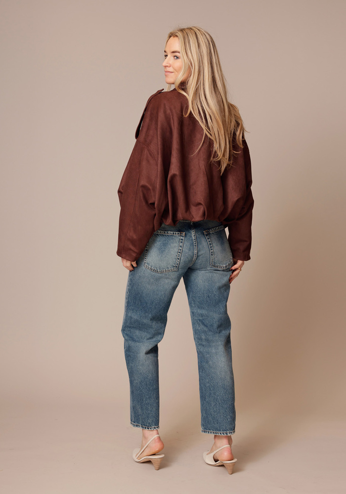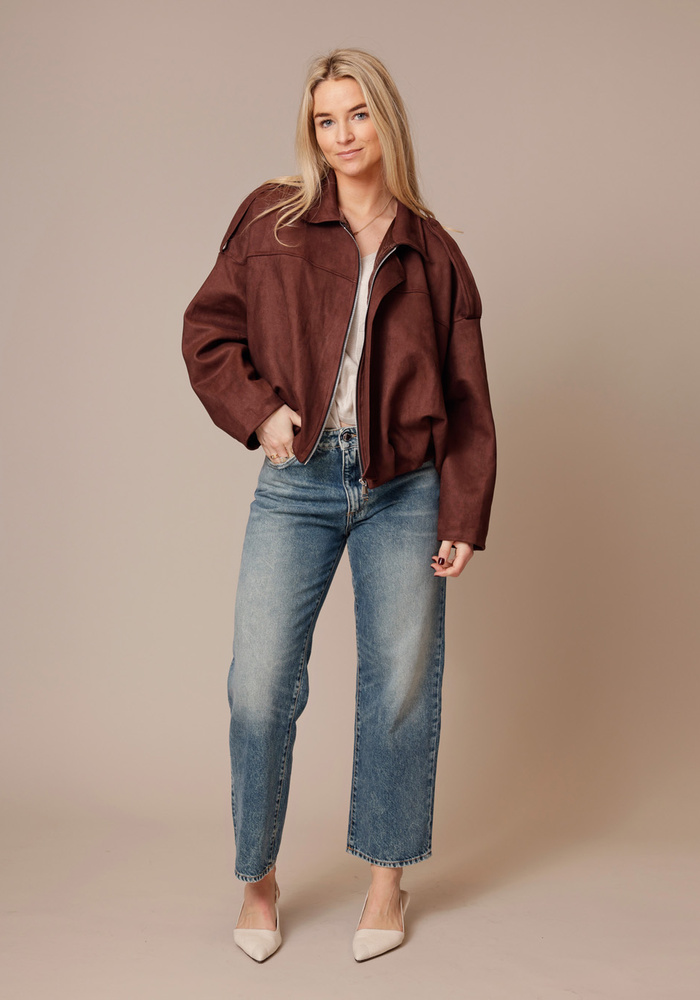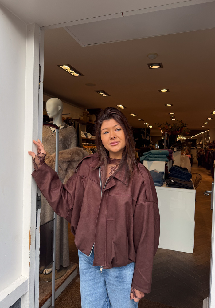 Deze jacket van Musthaves by Gentle is een bruin jasje met een oversized pasvorm. Het jasje valt kort en heeft een ritssluiting aan de voorzijde.