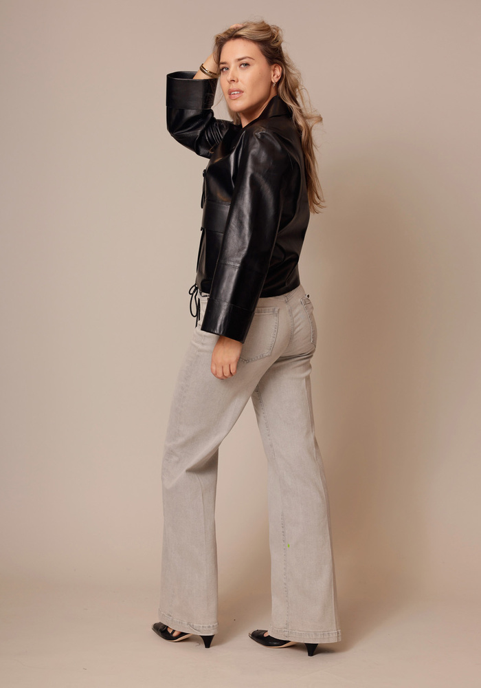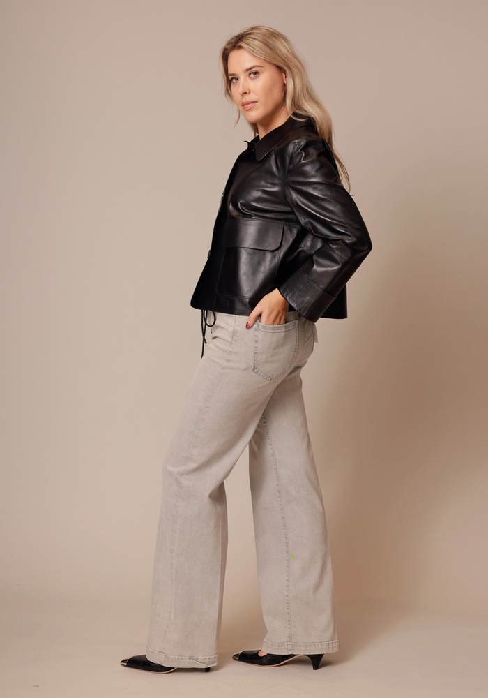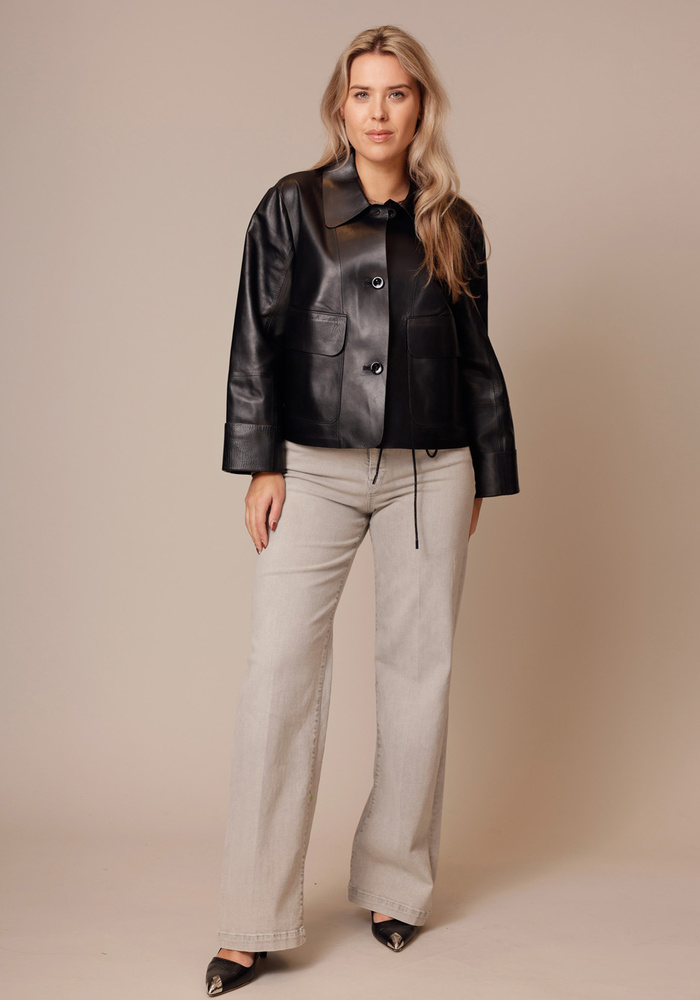 Elegante jas van Marccain van zacht lamsnappaleer met een moderne tweewegritssluiting. De wijde mouwen geven extra bewegingsvrijheid, terwijl de ribboorden aan mouwen en zoom voor een stijlvol contrast zorgen. Het hoogwaardige leer en de strakke afwerking geven de jas een luxe, minimalistische look. Duurzaam gecertificeerd met het “Rethink Together”-label.