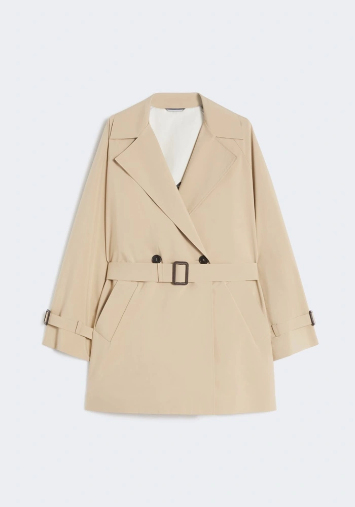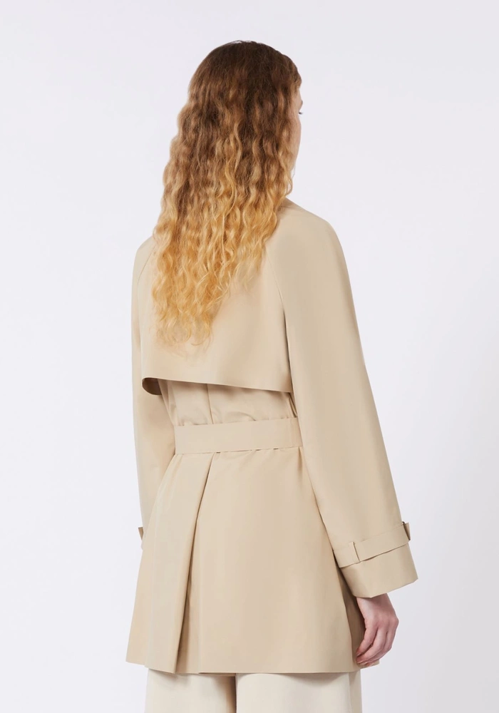 Deze jas van Weekend MaxMara is een korte trenchcoat met een ontspannen pasvorm, uitgevoerd in waterafstotend technisch canvas. Het model heeft een brede reverskraag en raglanmouwen aan de achterkant, voorzien van verstelbare manchettabs. De double-breasted knoopsluiting en de bijpassende ceintuur in de taille zorgen voor een klassieke trenchcoatlook, terwijl de paspelzakken aan de zijkant voor praktische elegantie zorgen. De binnenkant is gedeeltelijk gevoerd en afgewerkt met technische tape, met op het schouderstuk een Weekend Max Mara-logoprint voor een verfijnd detail.