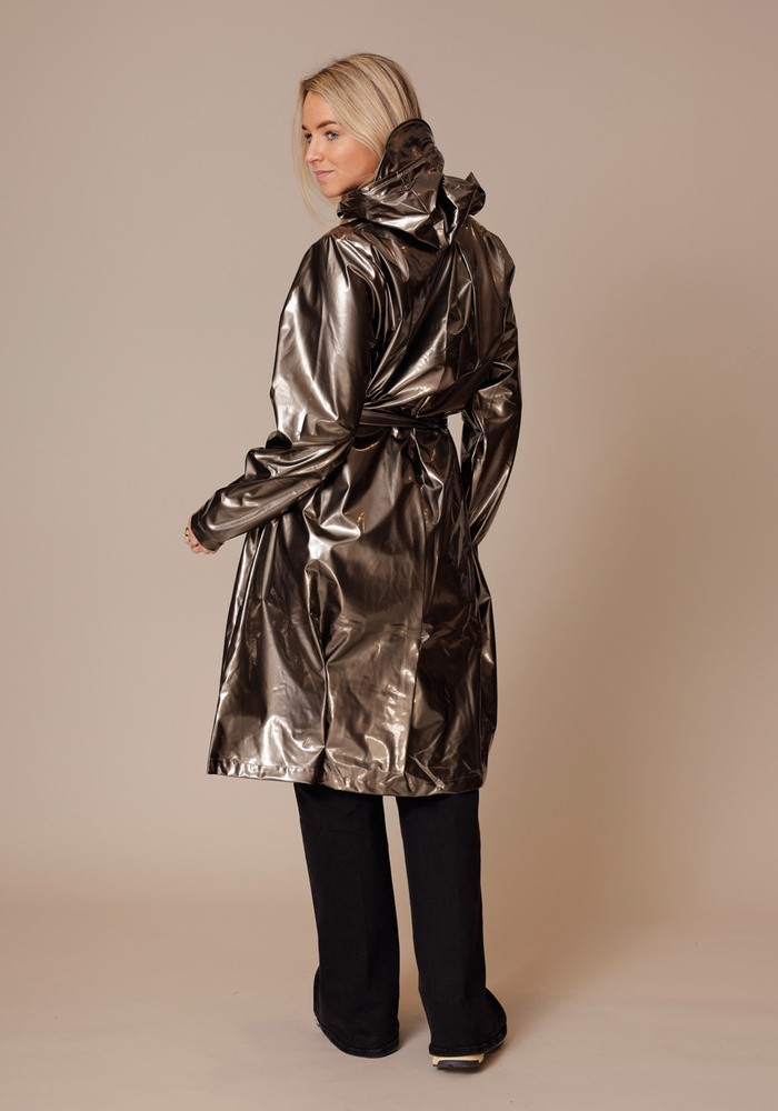 Curve long jacket van Rains is een regenjas voor dames die wordt gekenmerkt met ceintuur die de taille elegant accentueert.